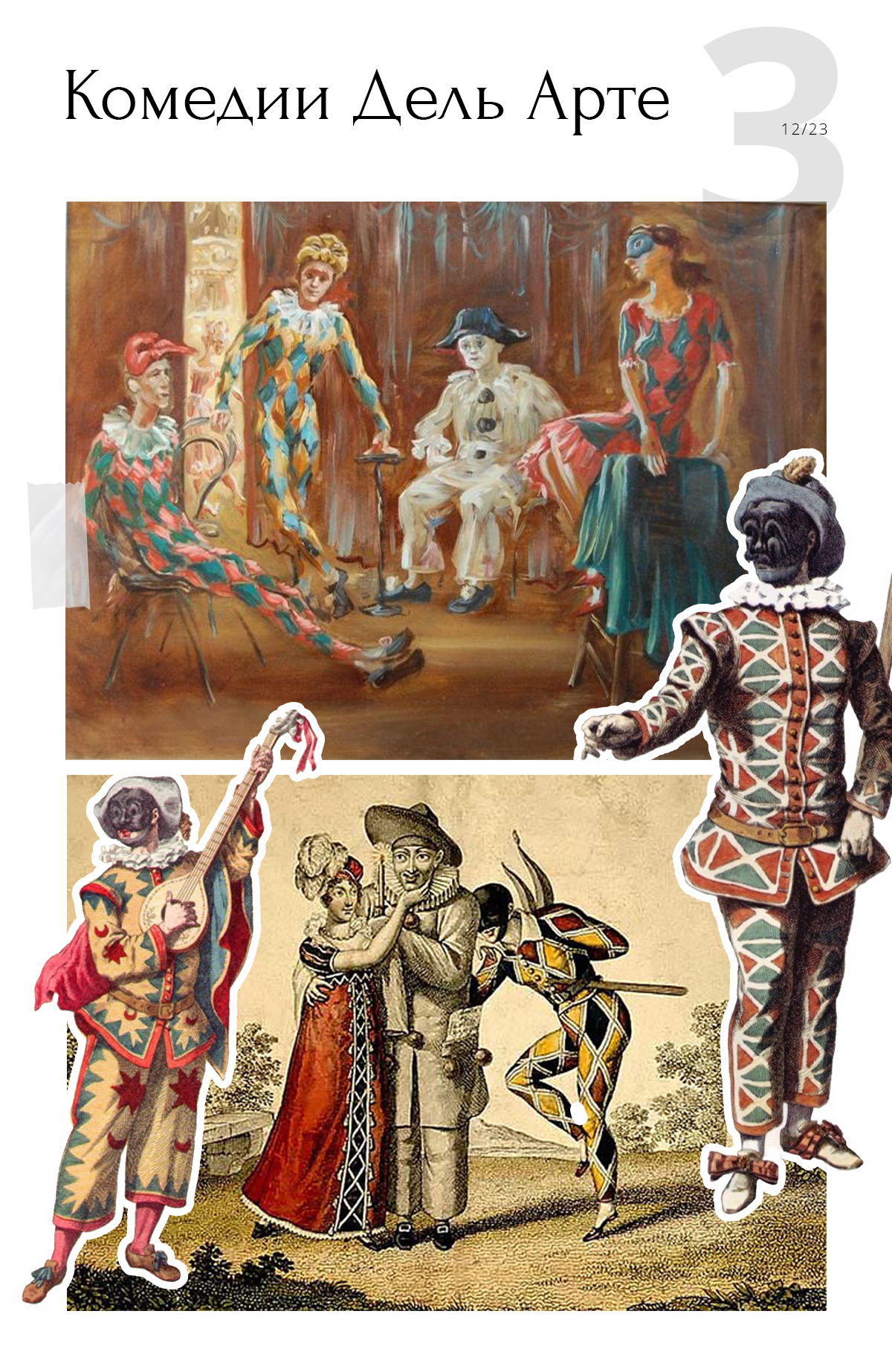 В XVI веке в Италии были популярны труппы бродячих артистов, которые играли комедии. Впоследствии их назвали Дель Арте. Их персонажи — Арлекин, Коломбина, Пульчинелла и другие — отличались особым характером, стилем поведения и манерой одеваться. Актеры выступали в масках, которые и сейчас надевают участники карнавала.
