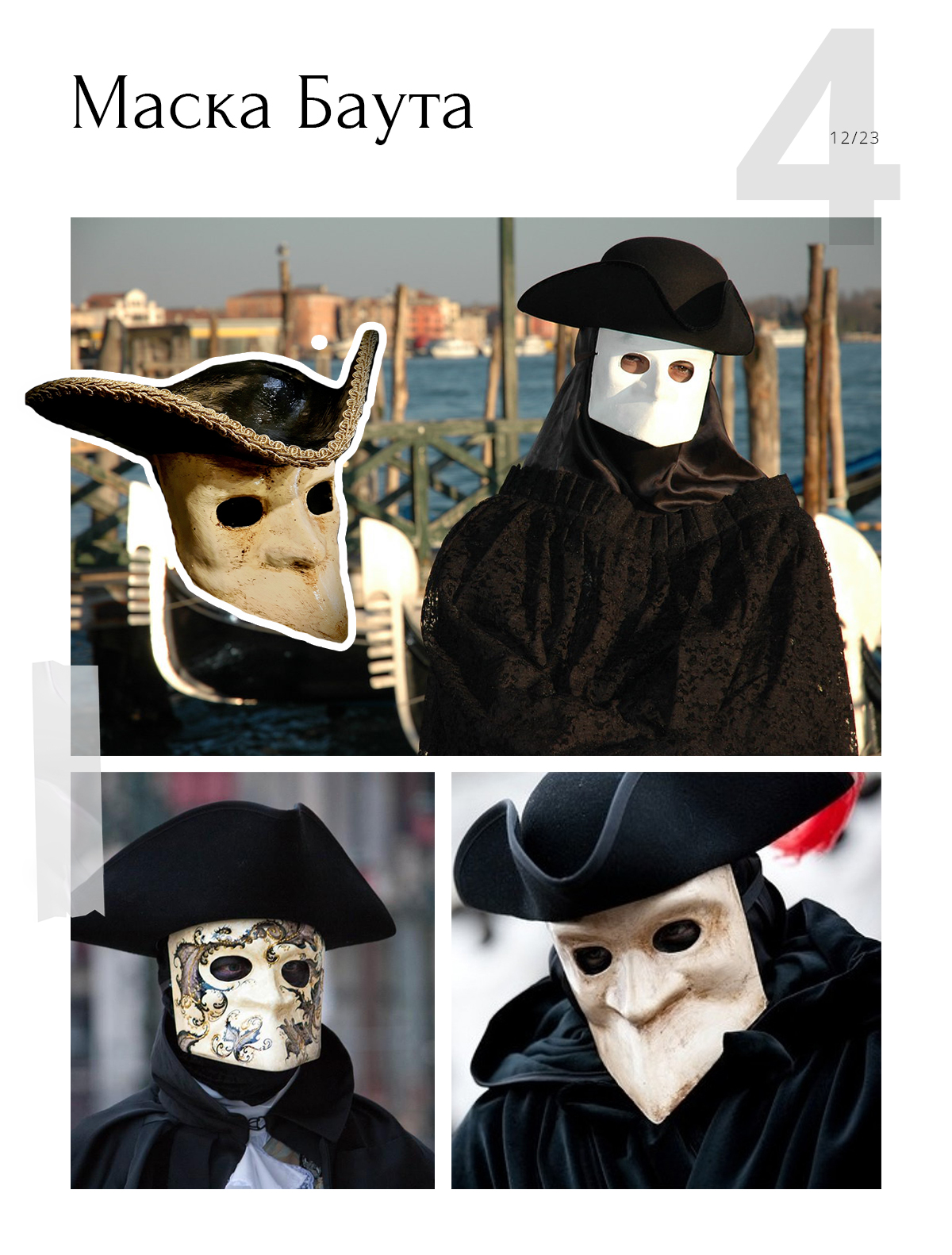 Маска Баута — одна из самых таинственных. По сути, это маска смерти со средневековых миниатюр. Именно ее любили надевать аристократы, которые хотели укрыться от любопытных взглядов на улицах. К ней прилагались черные плащ и треугольная шляпа. В таком виде можно было стать тенью.