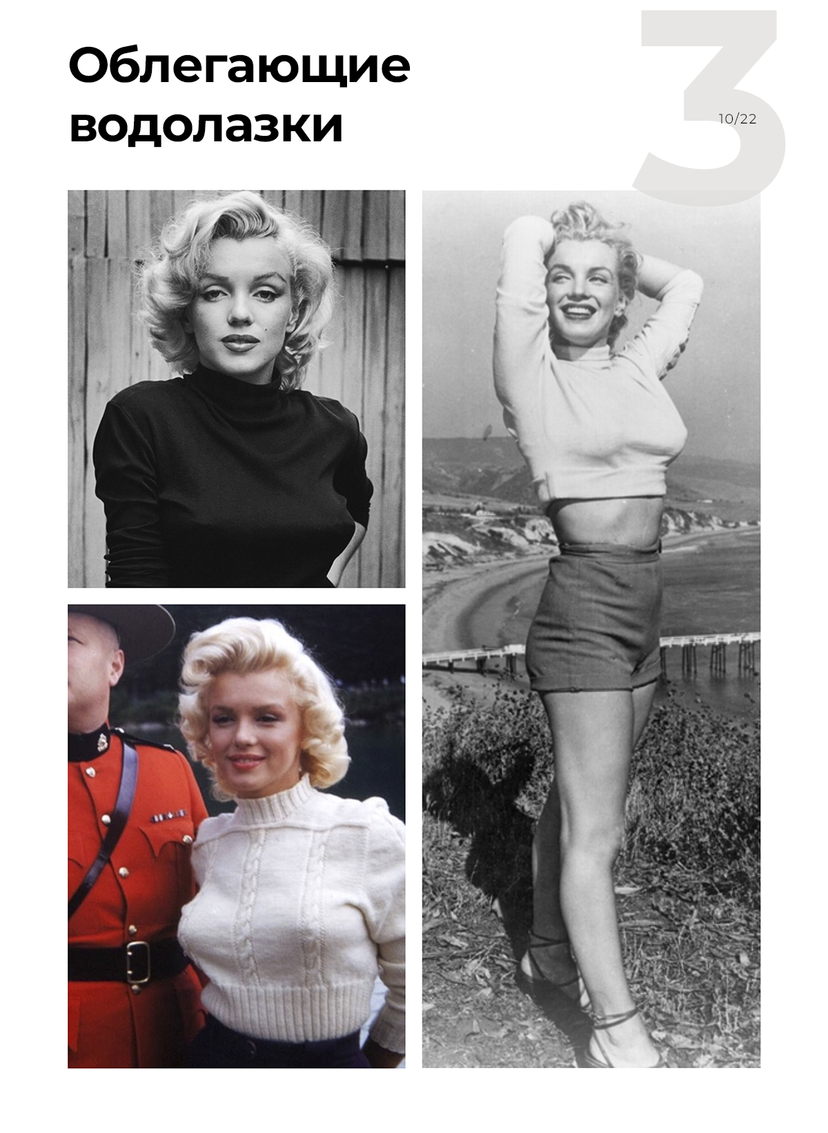 Мэрилин часто носила облегающие водолазки и укороченные свитеры по фигуре. Одна из них — бежевого цвета — входит в список из 20 памятных вещей гардероба актрисы. На одном из аукционов в 2010 году ее купили за 3 000 долларов. И это несмотря на то, что водолазку почти полностью съела моль.