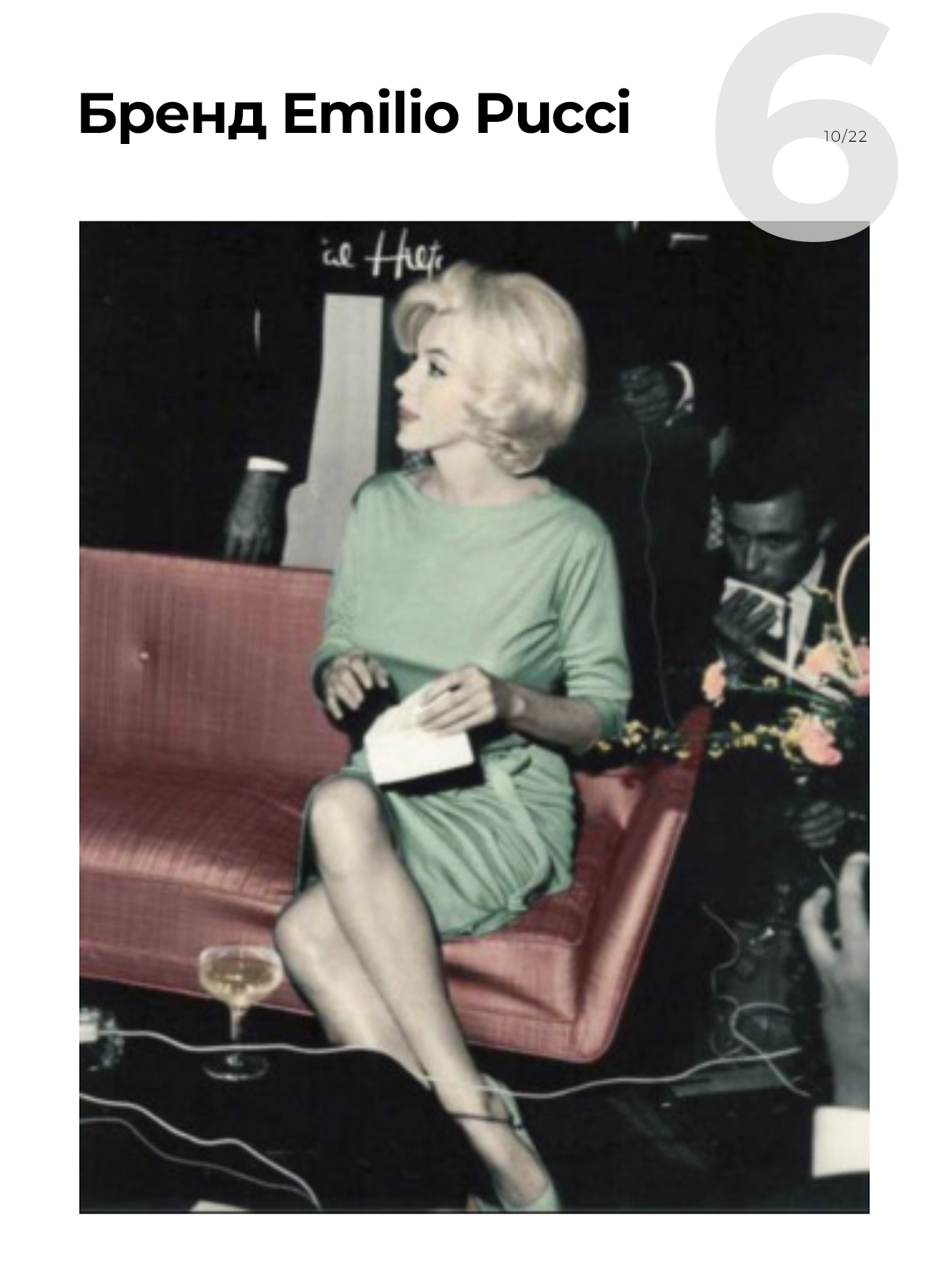 У Мэрилин было несколько десятков платьев от бренда Emilio Pucci. Правда, с ним связана и грустная часть истории — одежду этой марки она часто носила в последние месяцы жизни. Так, в зеленом платье она давала пресс-конференцию в Мексике в феврале 1962-го, а в августе того же года ее в нем похоронили.