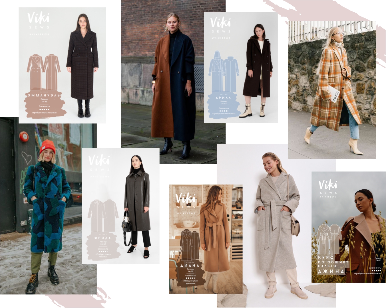 Выбрали себе модель? Готовые выкройки скачать можно в разделах «Верхняя одежда» и «Курсы» (здесь будут видеокурсы по пошиву шубки Лиа, пальто Хлоя, пальто из двухслойной ткани Джина, тренчкота Кэрри). И ткань заодно подобрать прямо на сайте в разделе «Материалы для пошива».