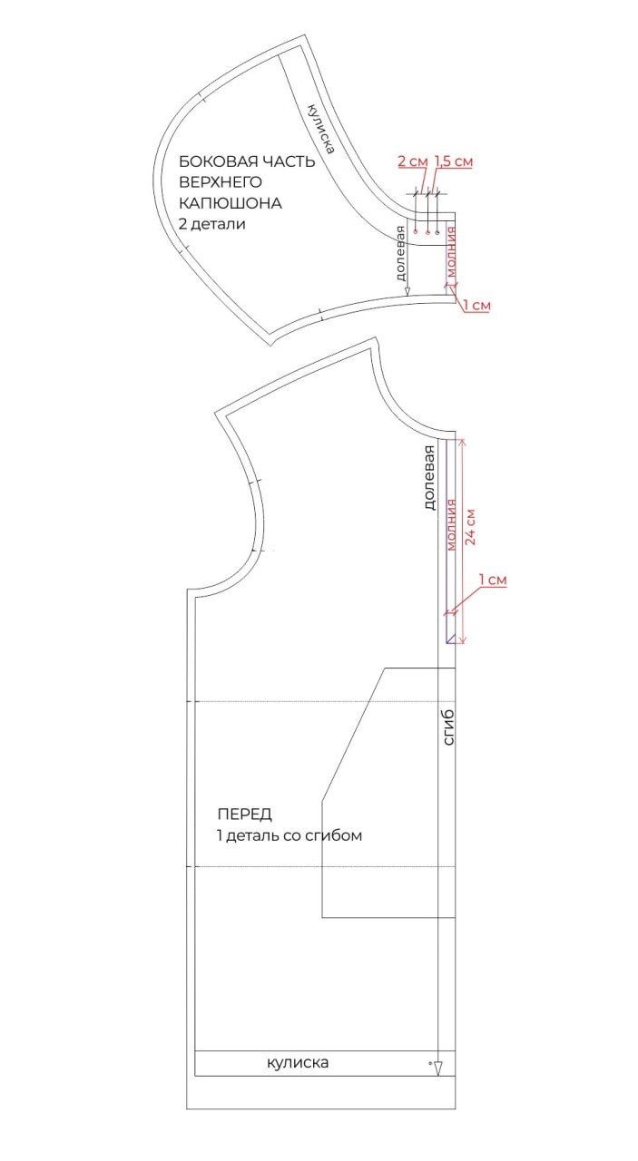 - На деталях переда и центральной части капюшона продублируйте припуск под обработку молнии.