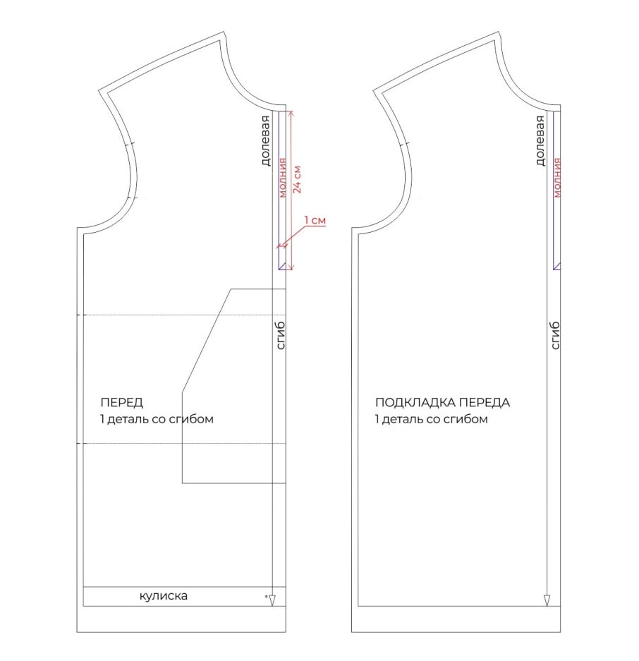 - На детали переда по линии сгиба от линии горловины вниз отмерьте 24 см и поставьте нижний край застежки.