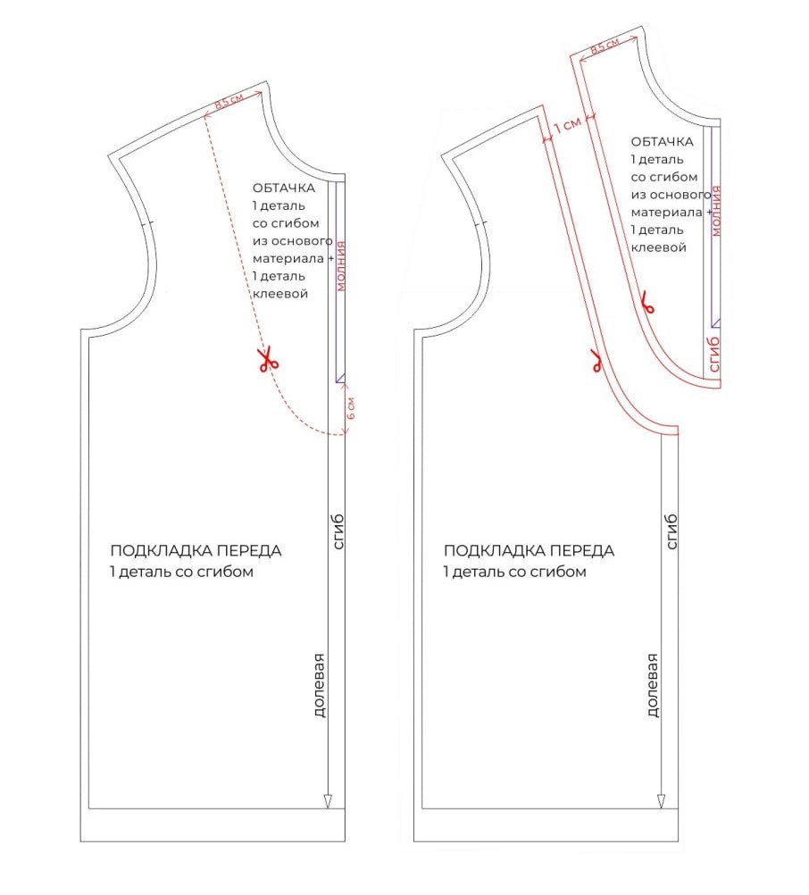 - Наметьте на детали подкладки контур обтачки. Разрежьте по нему и добавьте припуск 1 см.