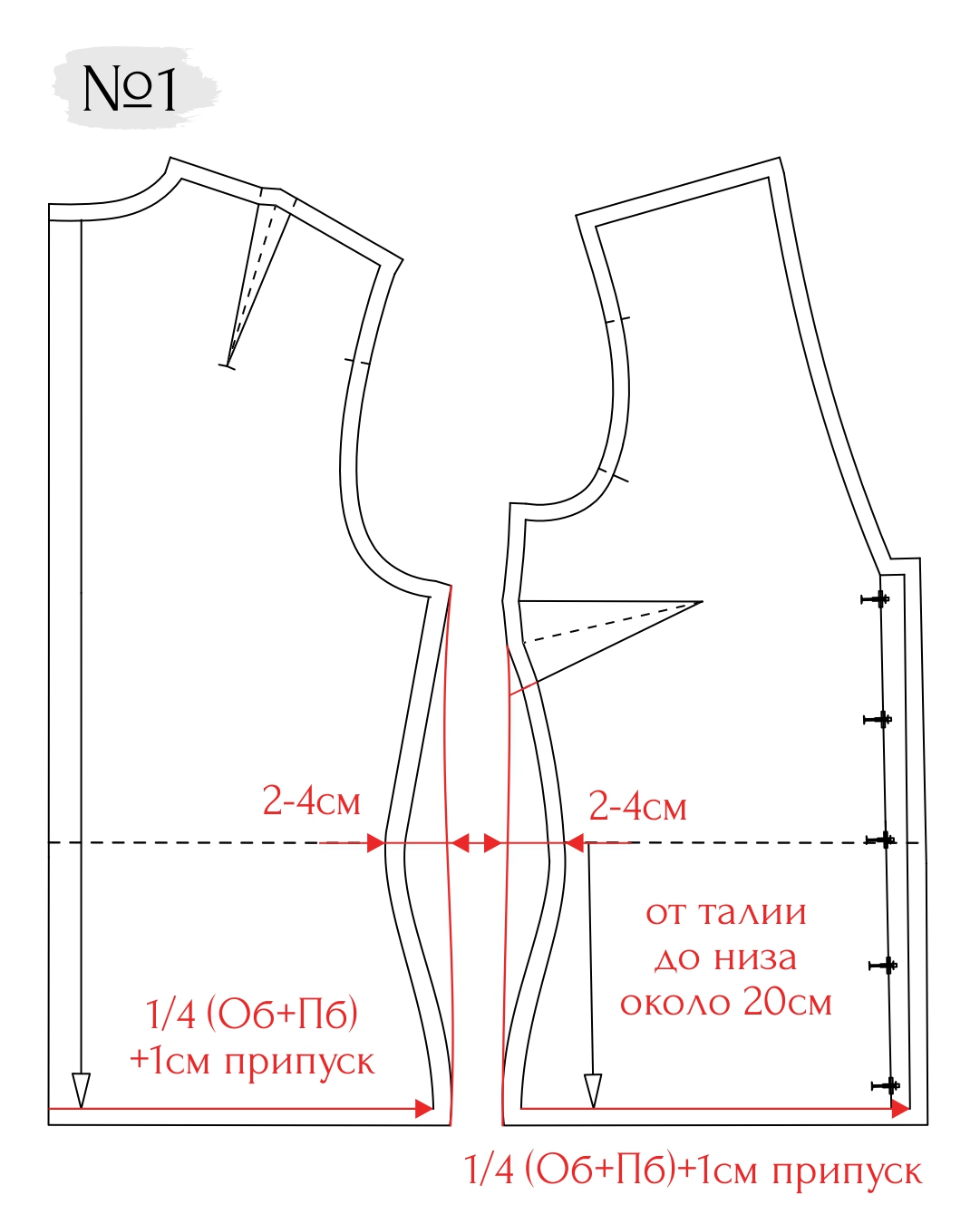 Например, для 36 размера Об = 90 см, Пб = 10 см, получаем: ¼ х (90+10) = 25 см + припуски (рис. 1).
