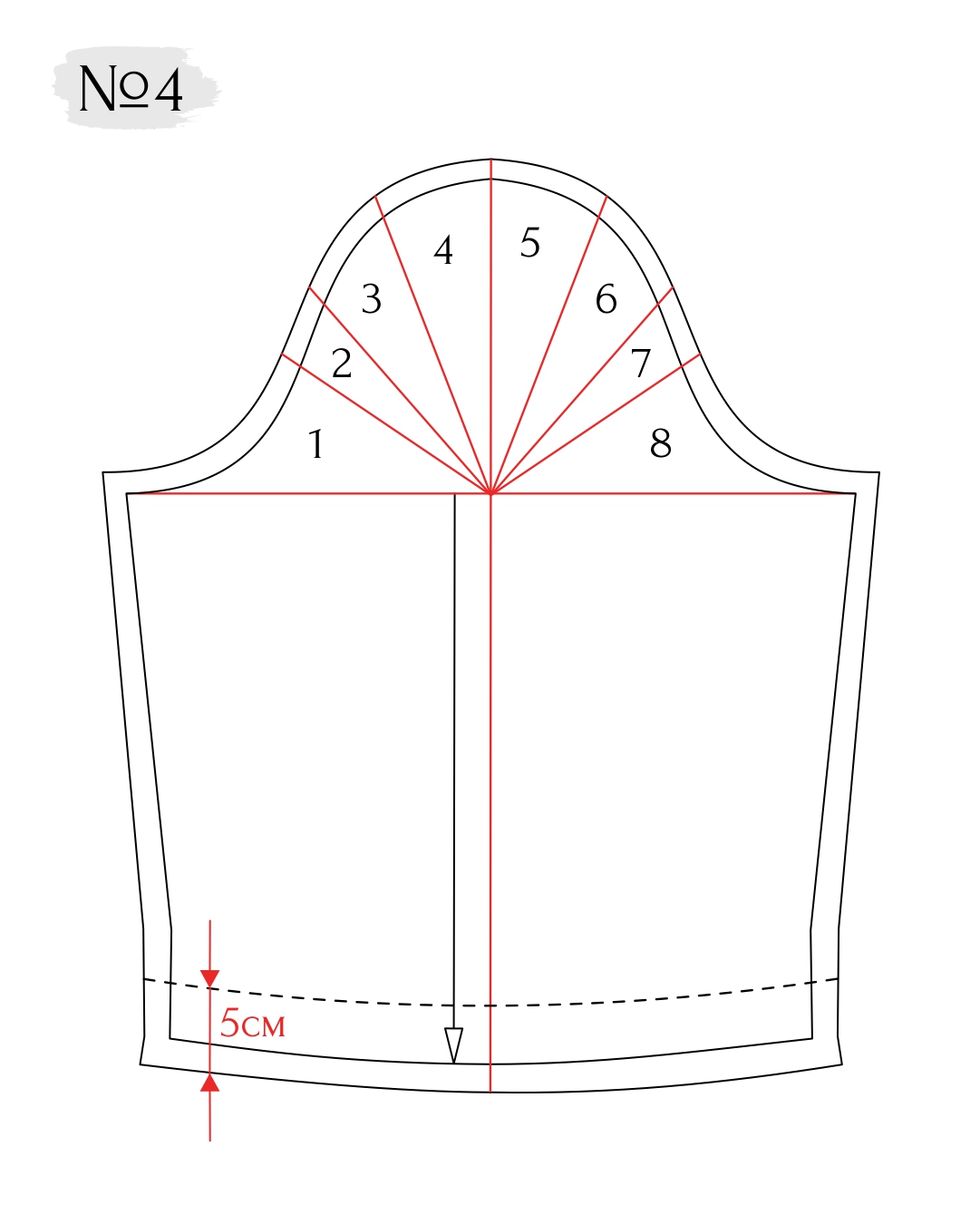 2. Начертите горизонтальную линию в самой широкой части рукава, соединяя высшие точки боковых срезов рукава. Опустите перпендикуляр из высшей точки оката рукава на горизонтальную линию и продлите ее до линии низа. Нанесите 7 лучей от точки пересечения линий к срезу оката. Важно! Пронумеруйте детали оката от 1 до 8.