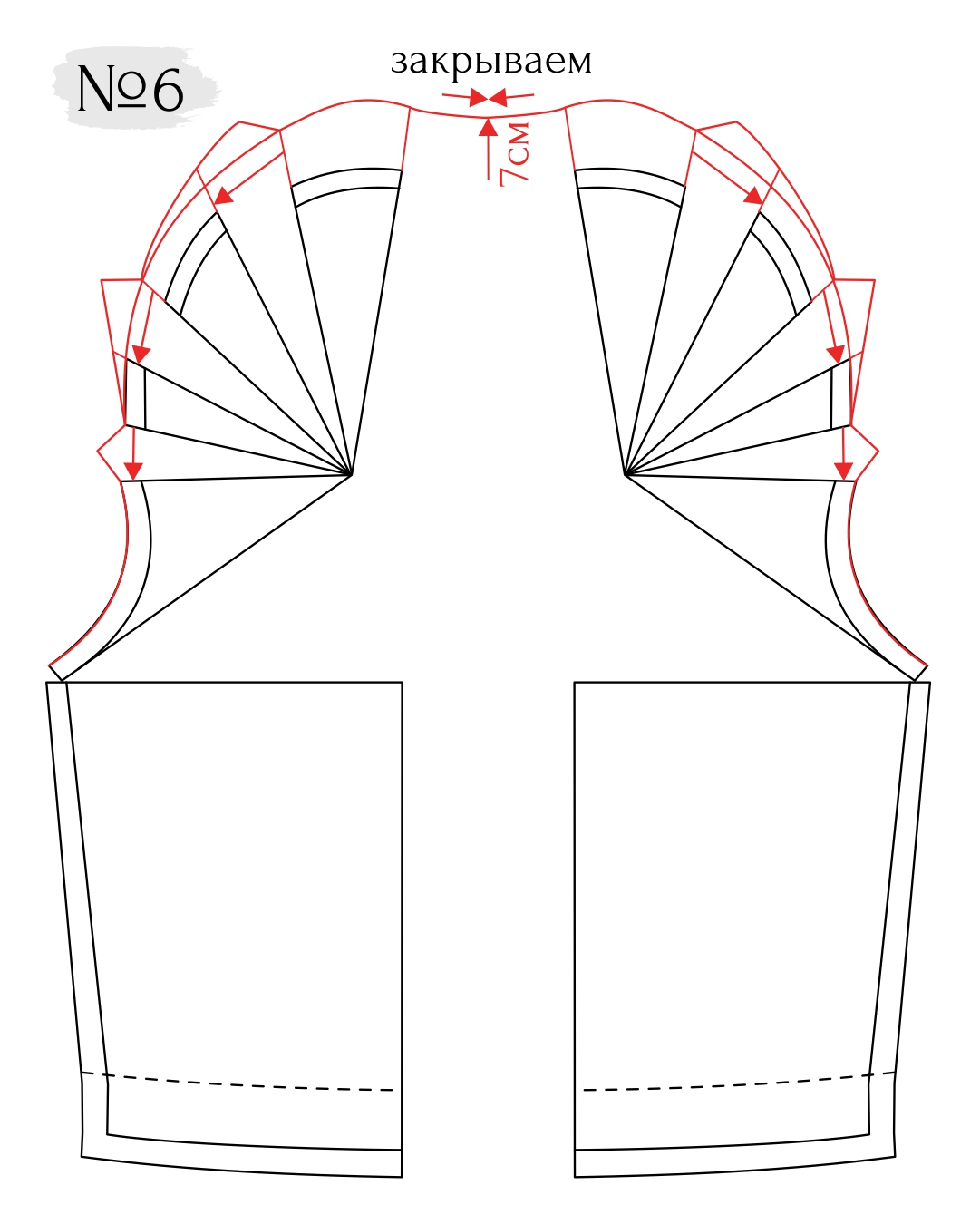 1. Сначала закройте складки рукава по схеме и укоротите рукав на 5 см. У вас должен получиться обычный рукав без складок.