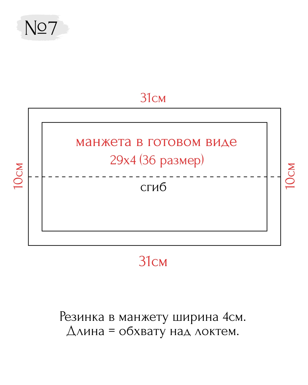 Для остальных размеров к вашей мерке «обхват над локтем» прибавляйте 7 см + 2 см на припуски.