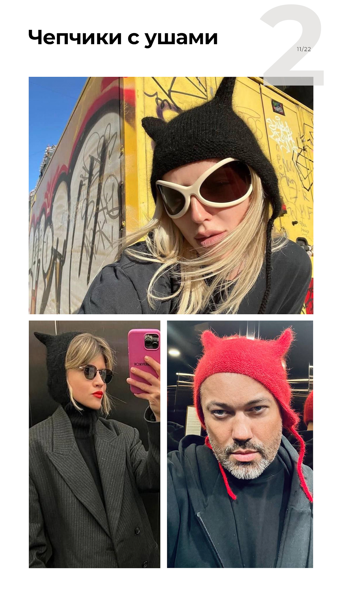 Инфантильные шапочки, как будто из детства, молниеносно вошли в моду и потеснили уже привычные балаклавы. Однотонные, в веселый принт и на завязках — выбирайте любой. Только не забудьте положить паспорт в сумочку, потому что чепчики сразу скидывают пару лет. В какую именно сумочку, расскажем ниже.