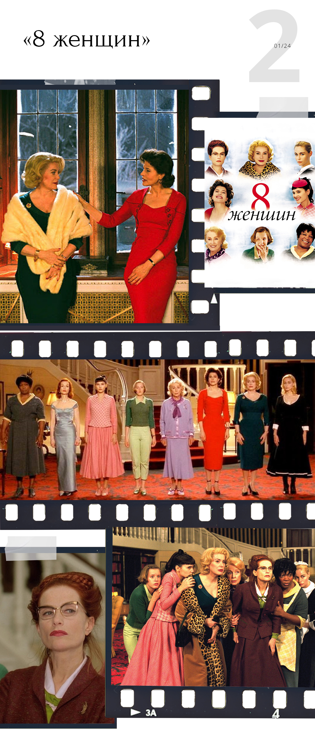 «8 женщин» — рождественский детектив Франсуа Озона с великолепным актерским составом: главные роли исполняют Катрин Денев, Изабель Юппер, Фанни Ардан. Кино стилизовано безупречно. По словам режиссера, его идеей было подчеркнуть женственность, красоту и гламур главных героинь, живущих в 50-е.