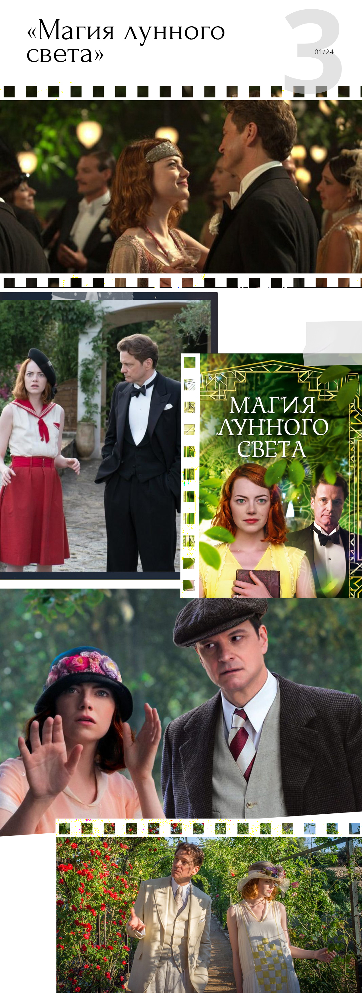 Романтическая комедия Вуди Аллена с Эммой Стоун и Колином Фертом «Магия лунного света» — это любовь, немного магии и великолепные костюмы в лучших традициях моды 20-х годов. Идеальный рецепт на новогодние каникулы.