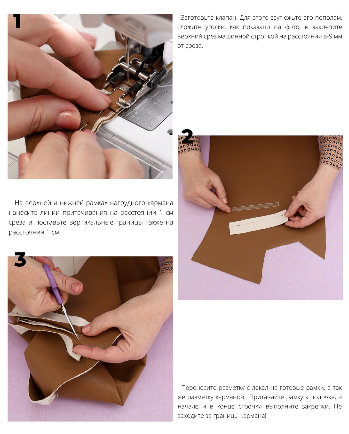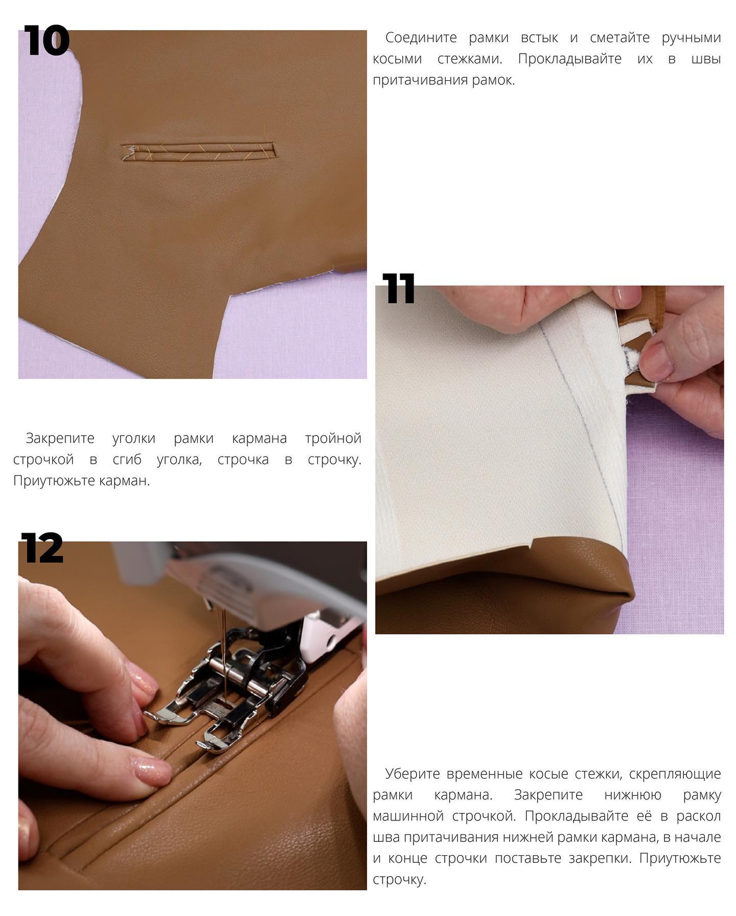 - Закрепите уголки рамки кармана тройной строчкой в сгиб уголка, строчка в строчку. Приутюжьте карман.