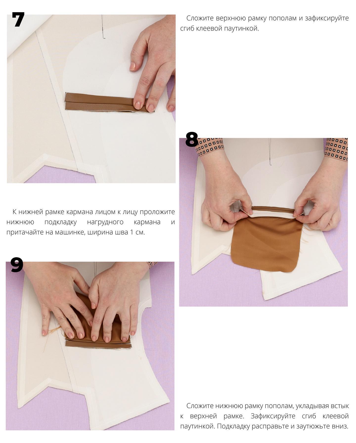 - К нижней рамке кармана лицом к лицу проложите нижнюю подкладку нагрудного кармана и притачайте на машинке, ширина шва 1 см.