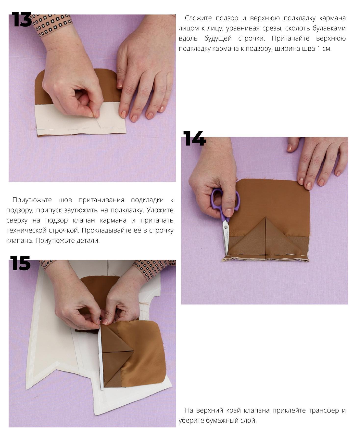- Приутюжьте шов притачивания подкладки к подзору, припуск заутюжьте на подкладку. Уложите сверху на подзор клапан кармана и притачайте технической строчкой. Прокладывайте ее в строчку клапана. Приутюжьте детали.