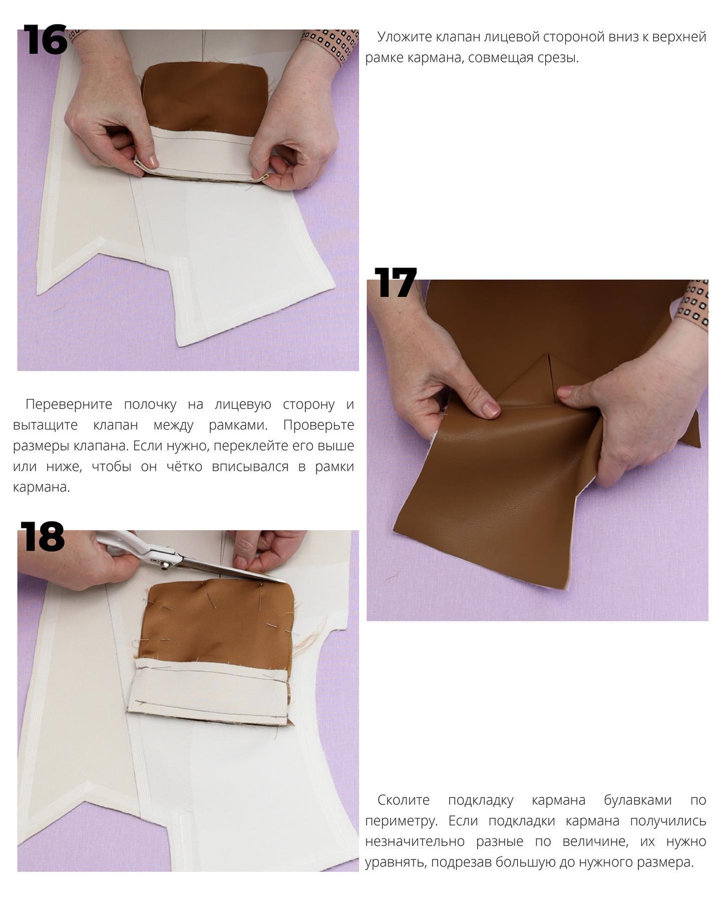 - Уложите клапан лицевой стороной вниз к верхней рамке кармана, совмещая срезы.