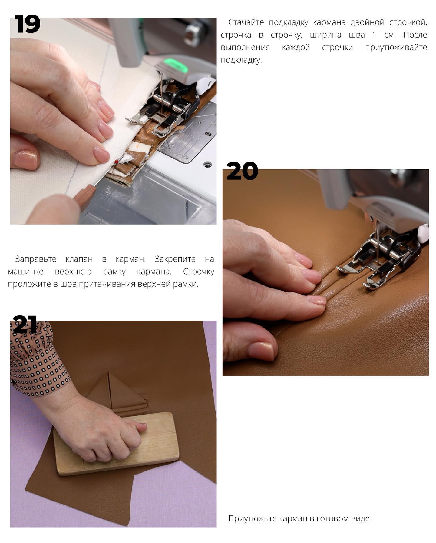 - Стачайте подкладку кармана двойной строчкой, строчка в строчку, ширина шва 1 см. После выполнения каждой строчки приутюживайте подкладку.