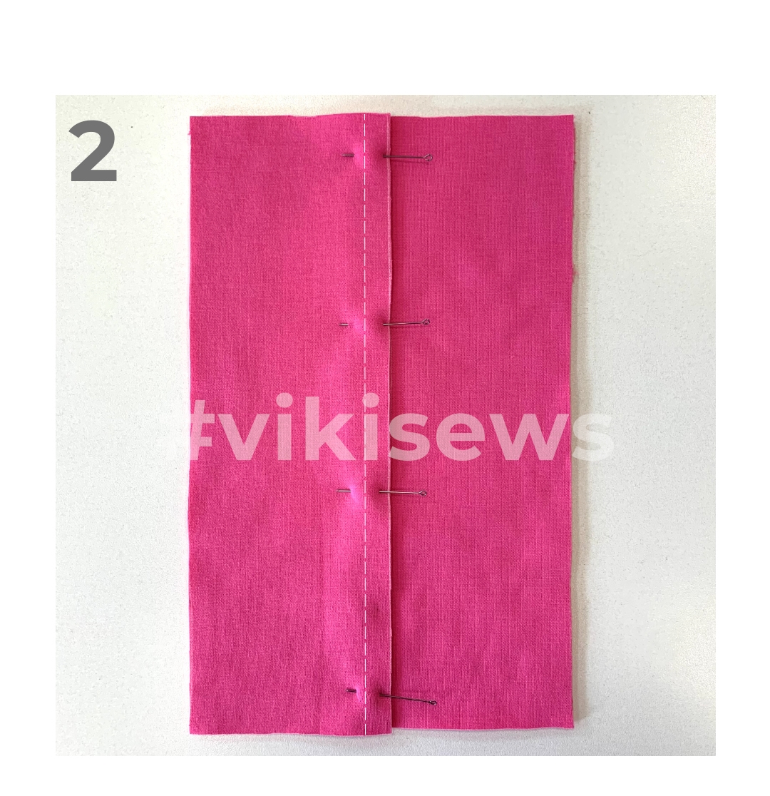 2. Уложите верхнюю деталь на нижнюю, уравнивая срез с вспомогательной линией. Сколите и стачайте на швейной машинке. Строчку прокладывайте на расстоянии 1 см от среза, а в начале и в конце поставьте закрепки.