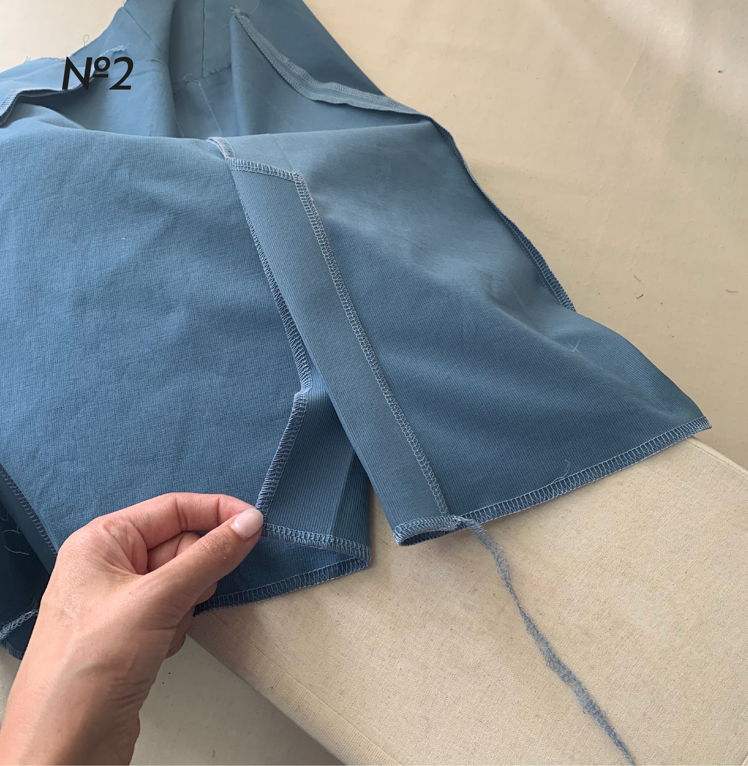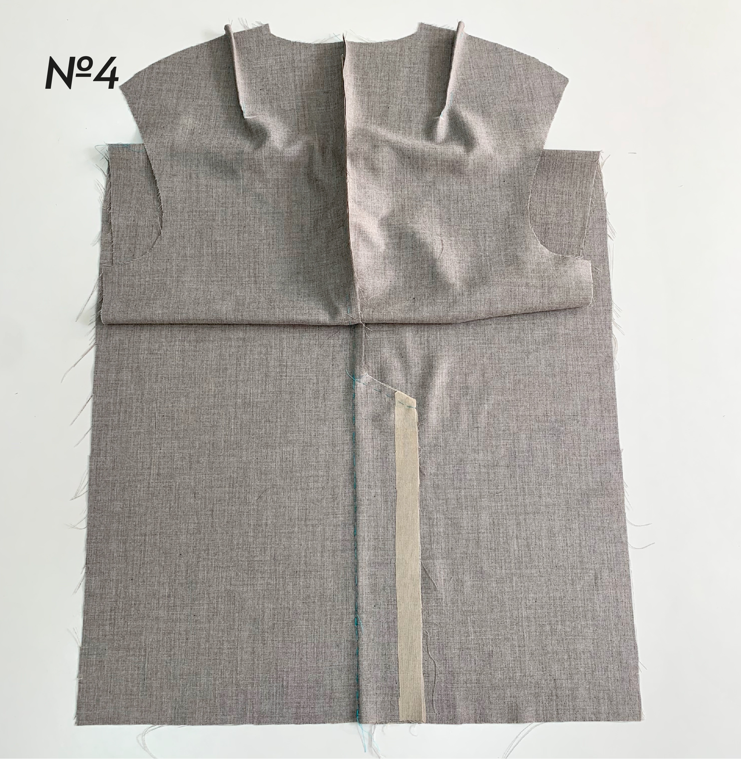 2. Стачайте шов, в котором она расположена. На участке шлицы шов сметывается или стачивается временной строчкой. Стежок увеличьте до максимального значения. Заутюжьте шлицу на левую половинку спинки (если посмотреть с изнаночной стороны, то направо (фото 4)).