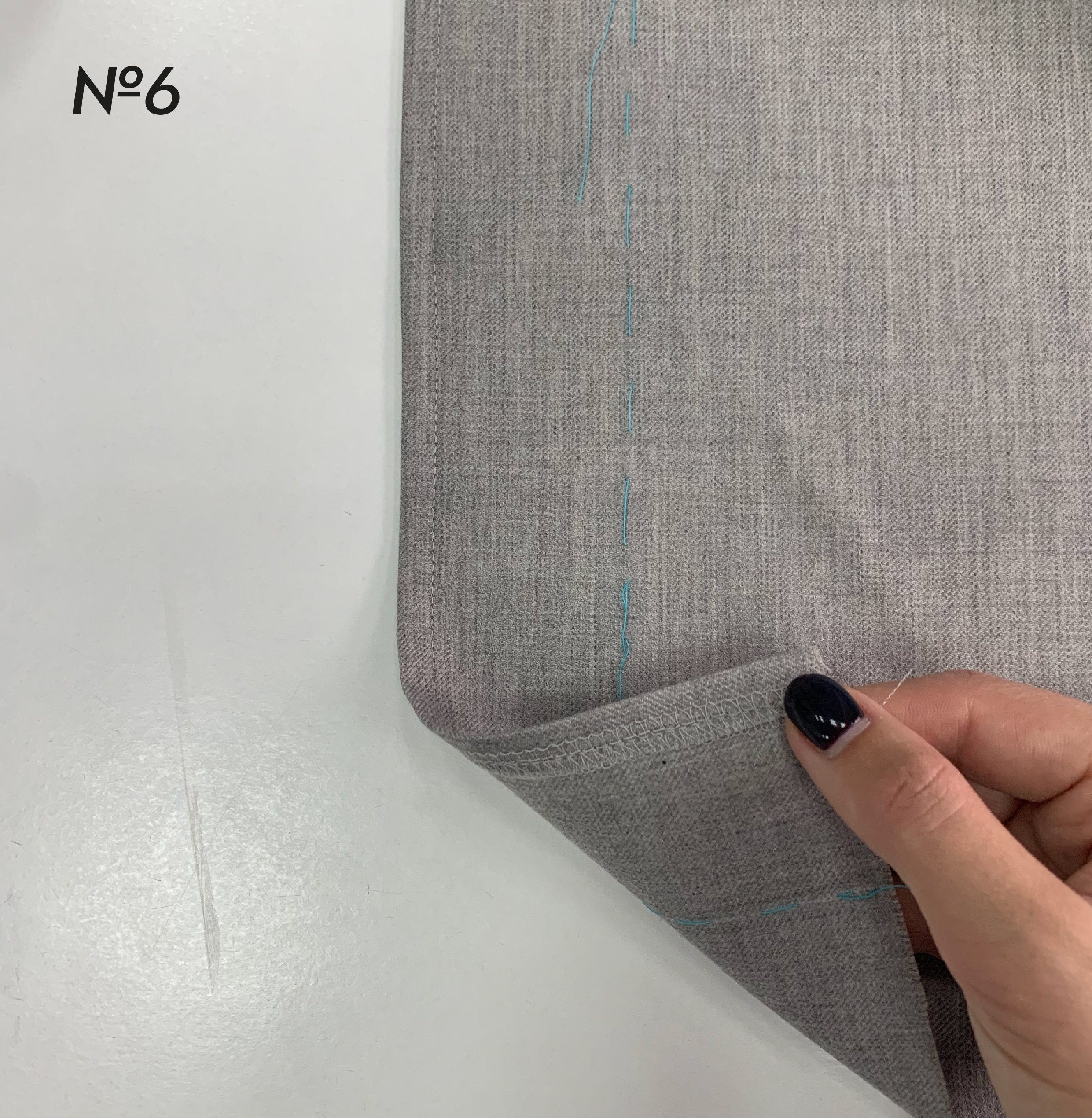 4. На правой половинке спинки на припуске шлицы отверните 1 см на изнаночную сторону и заутюжьте. Этот срез должен быть обработан вчистую, то есть не просто обметан, а обметан и подогнут на изнанку. Когда шлица открывается при движении, то этот срез становится видимым, поэтому должен быть аккуратным и красивым. Заметайте заутюженный припуск на шлице ручными стежками. Закрепите его машинной строчкой на расстоянии 0,5-0,8 см от заутюженного края. Машинную строчку можно заменить ручными потайными стежками. Приутюжьте обработанный край детали (фото 6).