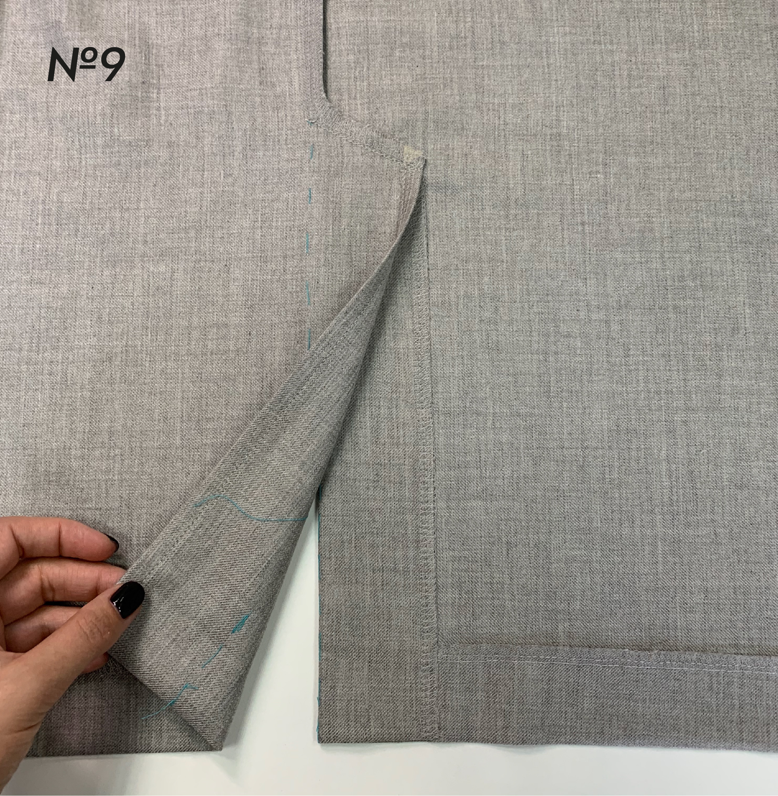 9. Далее необходимо подвернуть низ платья и одновременно сформировать уголки шлицы (фото 9).