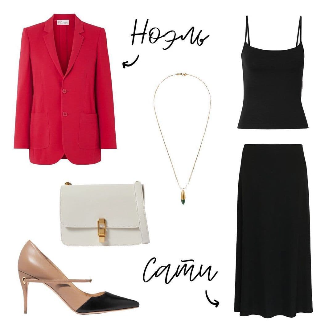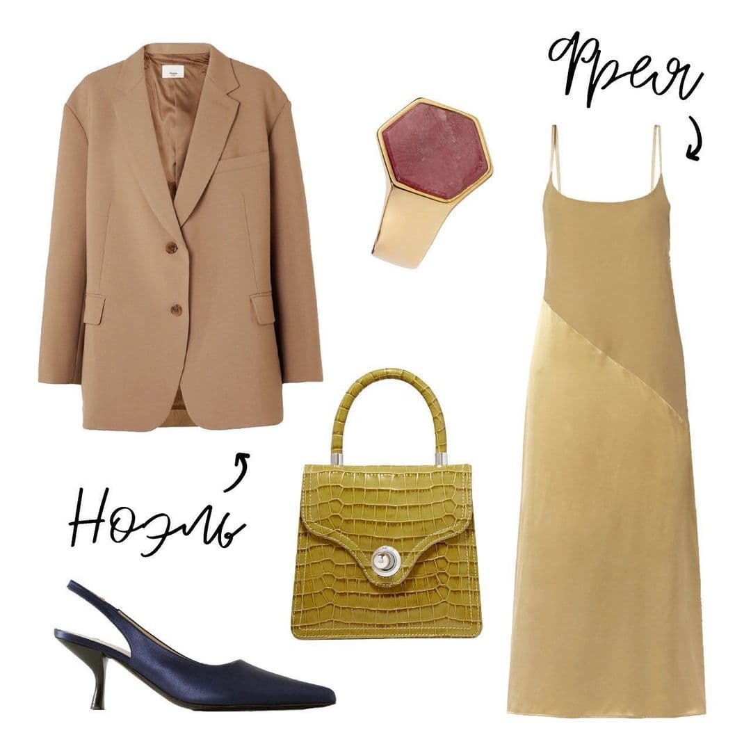 Тот же прием: жакет вторым слоем (желательно длиной ниже самой широкой части бедер). Накиньте его на плечи или наденьте полностью — как угодно. Платье-комбинация открывает верх, а юбка А-силуэта прикрывает низ и расставляет акценты. Жакет усложняет образ и также скрывает бедра, создавая нужную вертикаль.