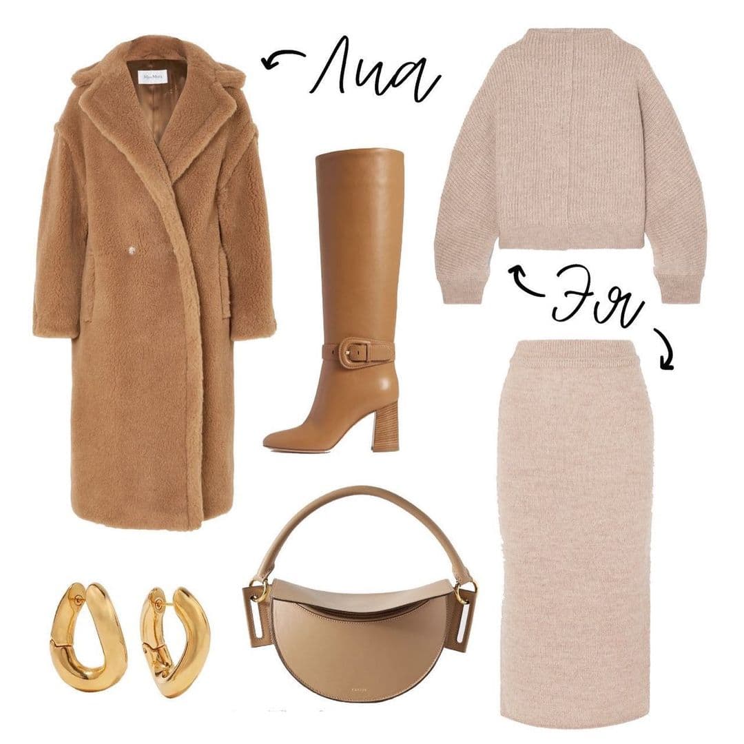 Пример монохромного образа. Здорово же? Цветовая вертикаль зрительно вытягивает силуэт. Шуба и сапоги в тон выполняют ту же задачу, а правильные для этого типа фигуры пропорции костюма Эя расставят нужные акценты.