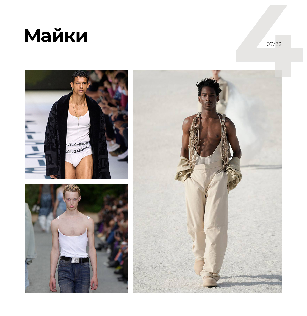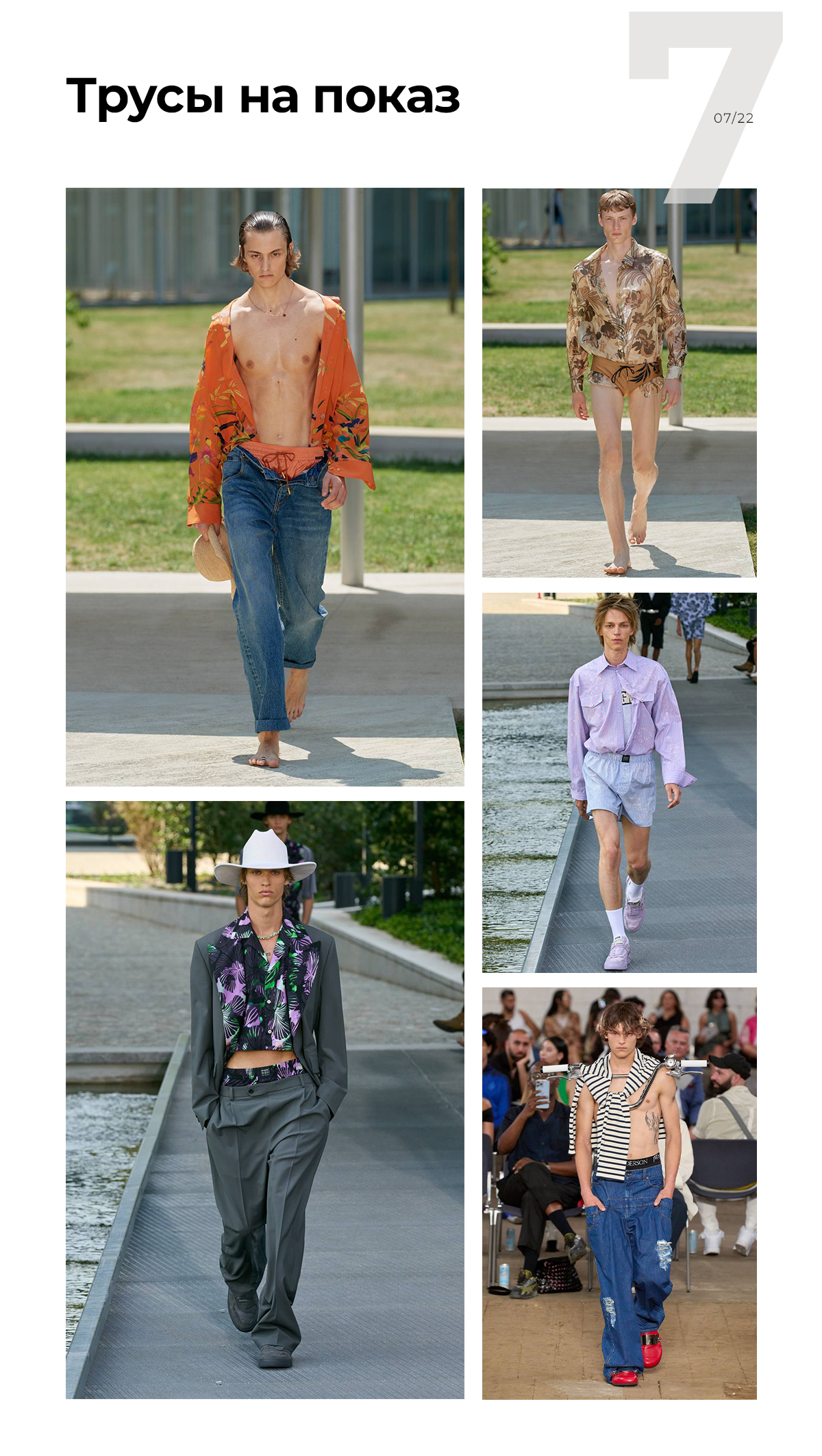 На всех показах были видны трусы. Иногда это в стиле 90-х, когда трусы выглядывают из-под джинсов на низкой посадке. Такой тренд вполне применим. Но когда трусы заменяют шорты — это прямо для дерзких ребят. Хотя почему бы не рассмотреть такой вариант для пляжной моды?