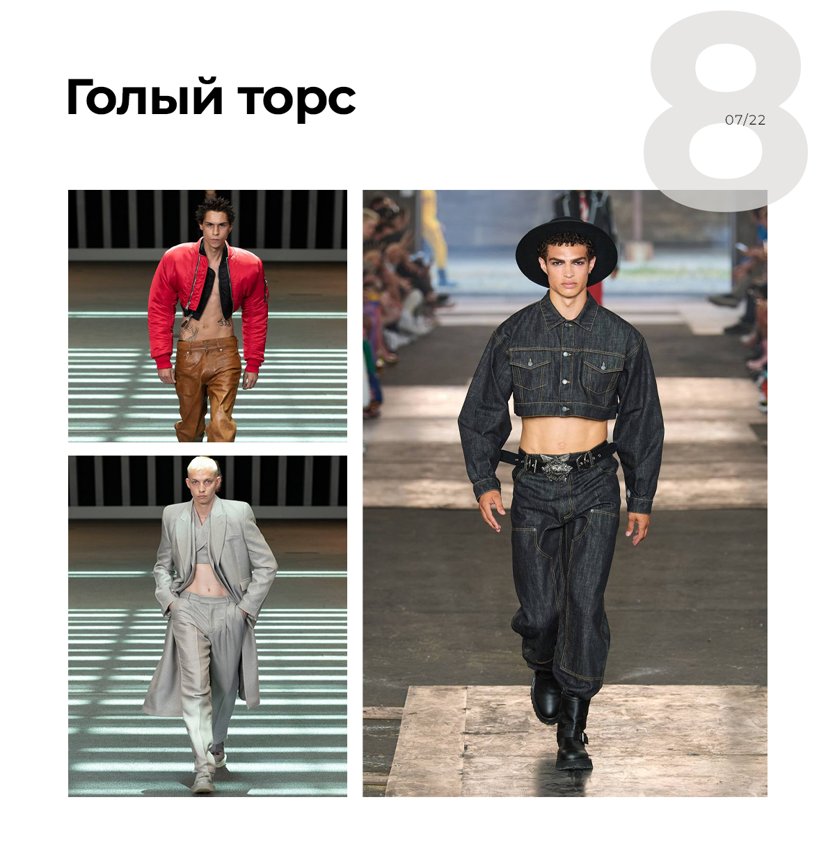 Голый торс — адаптация тренда из 80-х, когда был культ тела и мужчины с удовольствием показывали свой накачанный торс. Сейчас красивое тело – тоже обязательный элемент, если хочется следовать этому тренду.