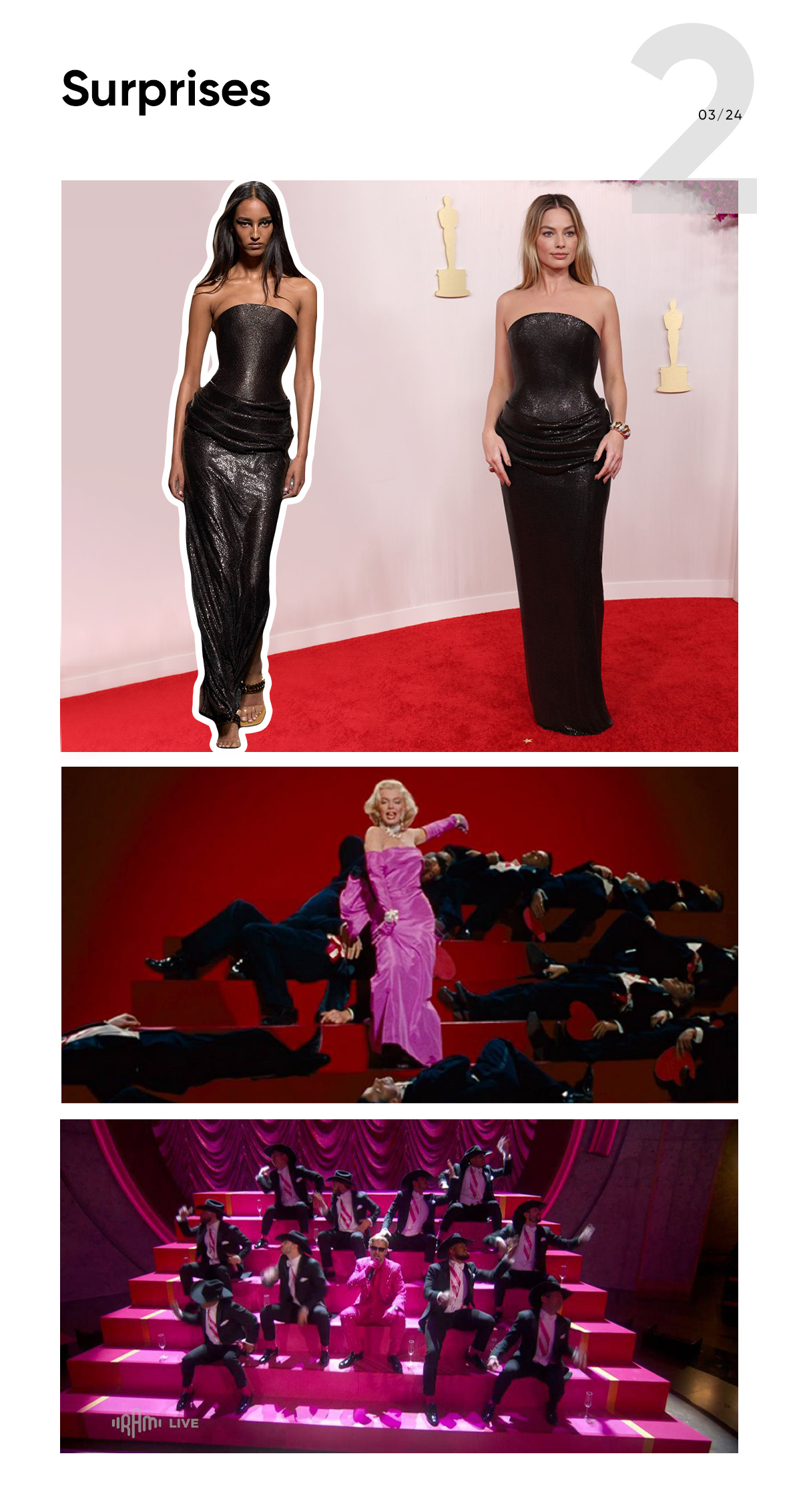 Yay, we finally saw Margot Robbie in anything but Barbie pink! The star graced the red carpet in the black Versace gown from the Fall 2024 collection. What a stunning style shift. On the contrary, her co-star Ryan Gosling sang his Ken song in a hot pink dazzling suit. His performance looked like an homage to Marilyn Monroe’s iconic “Diamonds Are a Girl’s Best Friend.”