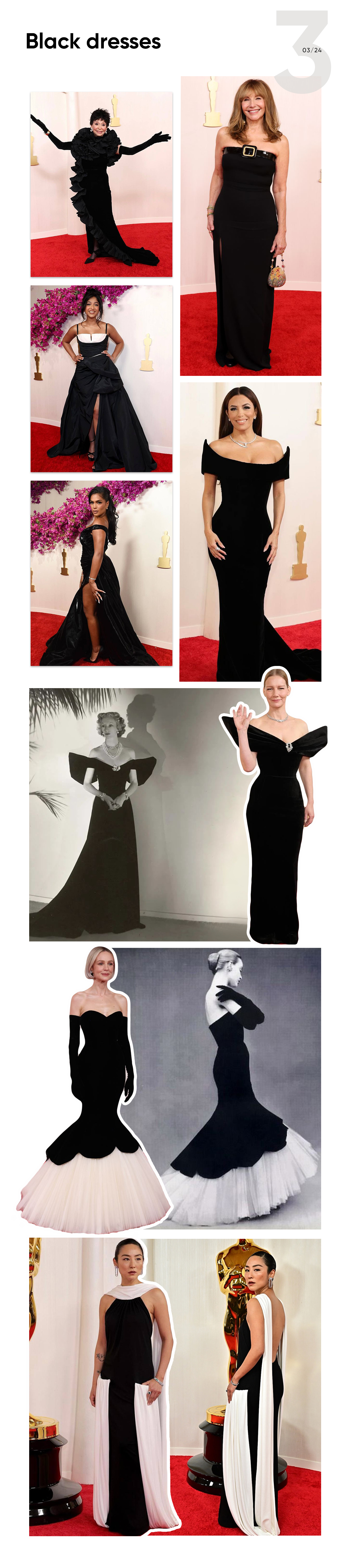 There were a lot of black dresses on this year’s red carpet as if there was a secret dress code. One of the most spectacular total black looks was Sandra Hüller in Schiaparelli. The dress aimed to reference the 1947’s look of socialite Millicent Rogers. Carey Mulligan appeared in a reinvented 1951 Balenciaga gown. The other look to remember was Greta Lee’s silk Loewe dress.