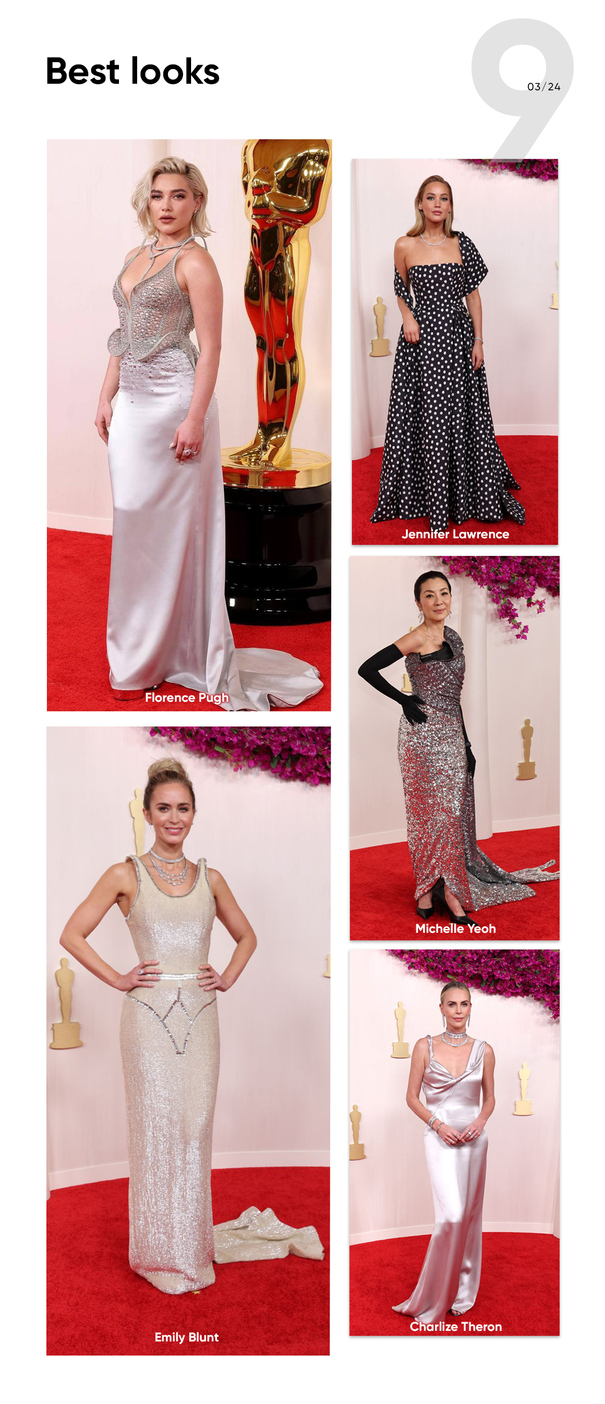 Jennifer Lawrence picked an unusual Dior polka dot gown. Charlize Theron looked stunning in her elegant and classy gown. Michelle Yeoh had a great fashion moment in Balenciaga couture. Florence Pugh shockingly decided to choose Del Core instead of Valentino and looked gorgeous. Emily Blunt looked amazing in Schiaparelli, but we recommend checking the dress out on a video because the photos don’t convey its beauty.