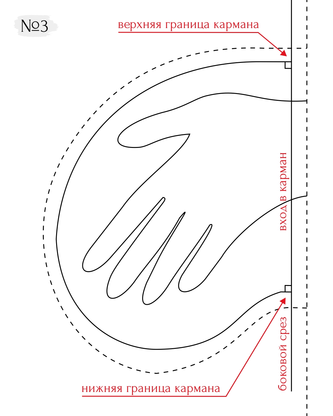 3. На листе бумаги начертите вертикальную линию бокового среза изделия или, если она выпуклая, перенесите ее с лекала. Отступая от верхней границы листа, поставьте отметки входа в карман. Приложите между ними ладонь и представьте, что так она находится в кармане. Отступая 1,5-2 см от контура пальцев, обведите пунктиром контур будущей мешковины. К боковому срезу сверху и снизу линии мешковины должны подходить под углом 90 градусов. Контур делайте полукруглой формы. Далее обведите его лекальной линией. Достройте припуски 1-1,5 см по всему периметру на обработку кармана (рис. 3).