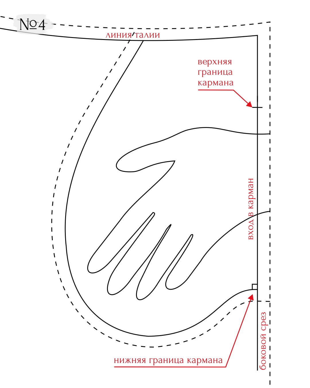 Если вы строите карман в изделии с отрезной линией талии или в поясном изделии, то верхний край кармана — это линия талии изделия. А внешний контур мешковины при оформлении линии подходит не к верхней границы кармана, а уходит под наклоном вверх к линии талии и повторяет верхний срез детали, т.е. срез линии талии. Такой карман удобно строить на основных лекалах изделия, например передней половинке брюк или юбок. Так верхний и боковой срезы кармана четко повторят основные линии изделия (рис. 4).