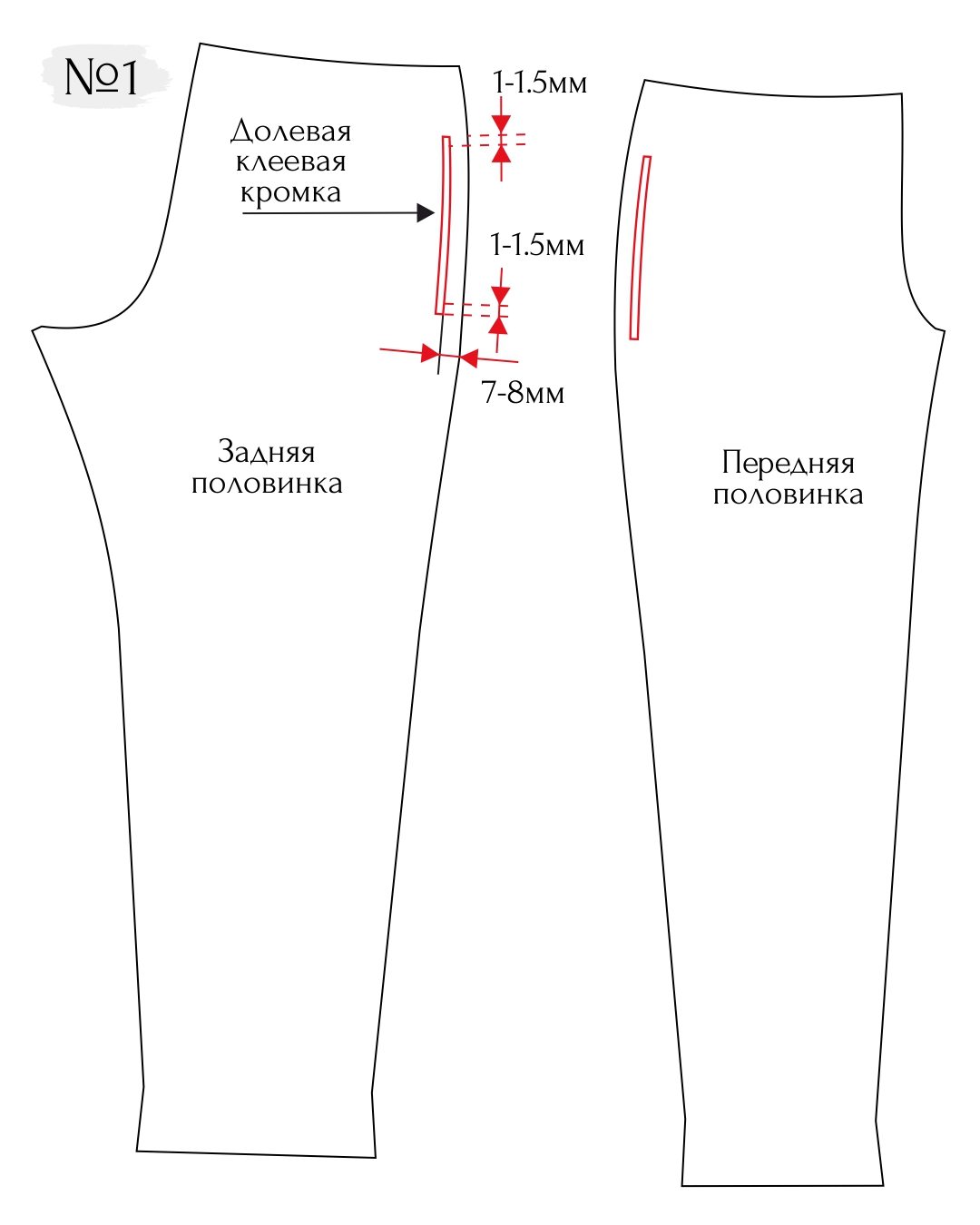1. Укрепите долевой клеевой кромкой линию входа в карман на передней и задней половинках брюк. Клеевая кромка заходит сверху и снизу за границы кармана на 1-1,5 см. От бокового среза кармана кромка приклеивается на расстоянии 7-8 мм, чтобы она в дальнейшем попала в шов.