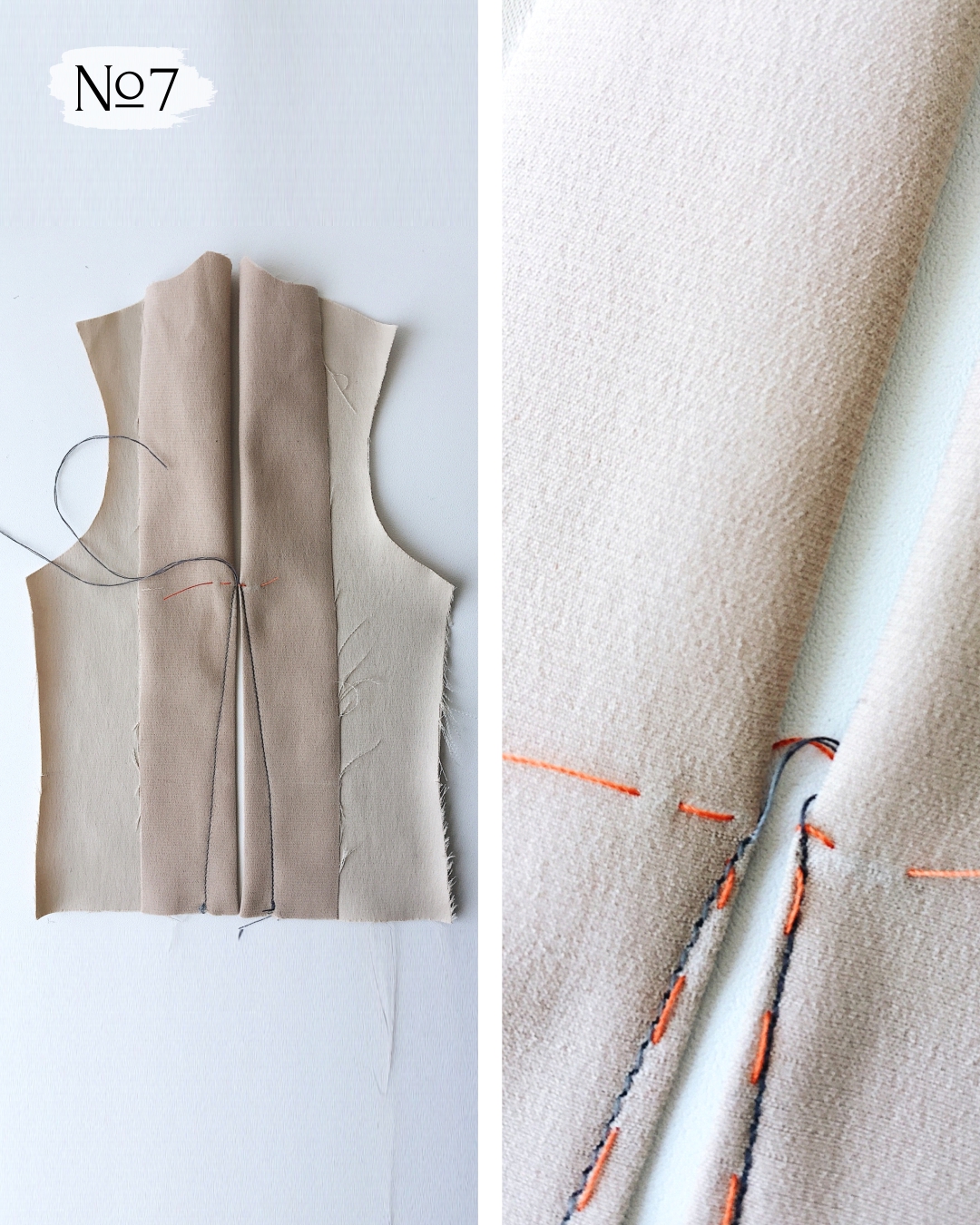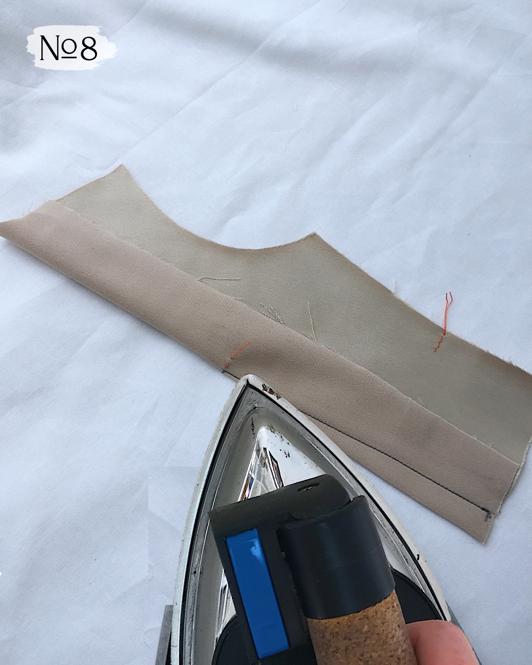 8. Удалите наметку, сделанную по косым линиям стачивания, оставьте перпендикулярные стежки, которые ограничивают вершину вытачки, и приутюжьте.