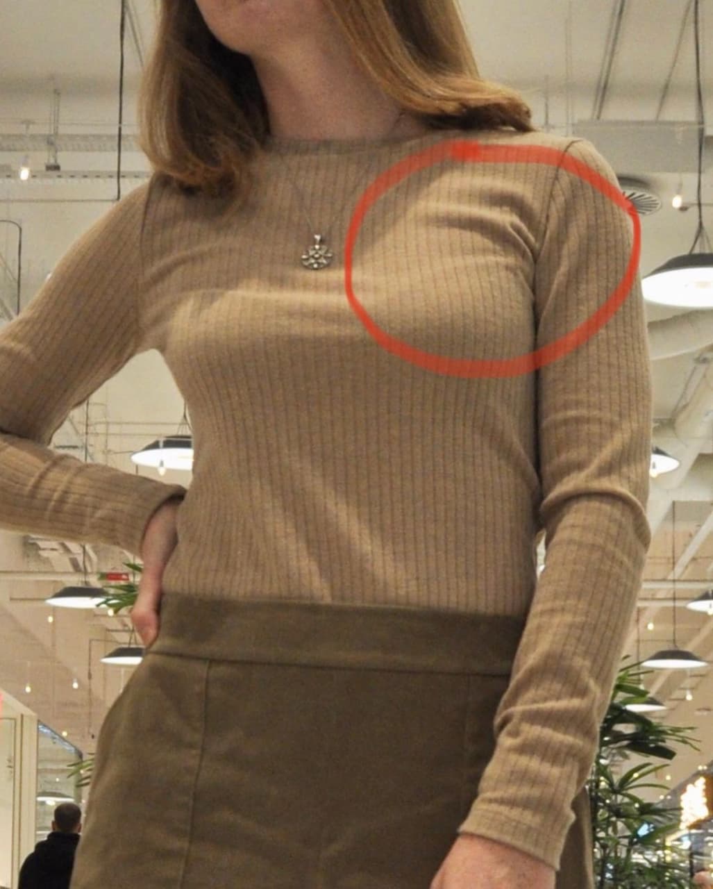 - Лонгслив немного великоват (см. в области проймы). Возможно, использован чуть более эластичный материал, чем предусмотрено. Прибавка здесь заложена минусовая (к обхвату груди минус 10 см), изделие должно сидеть достаточно плотно.