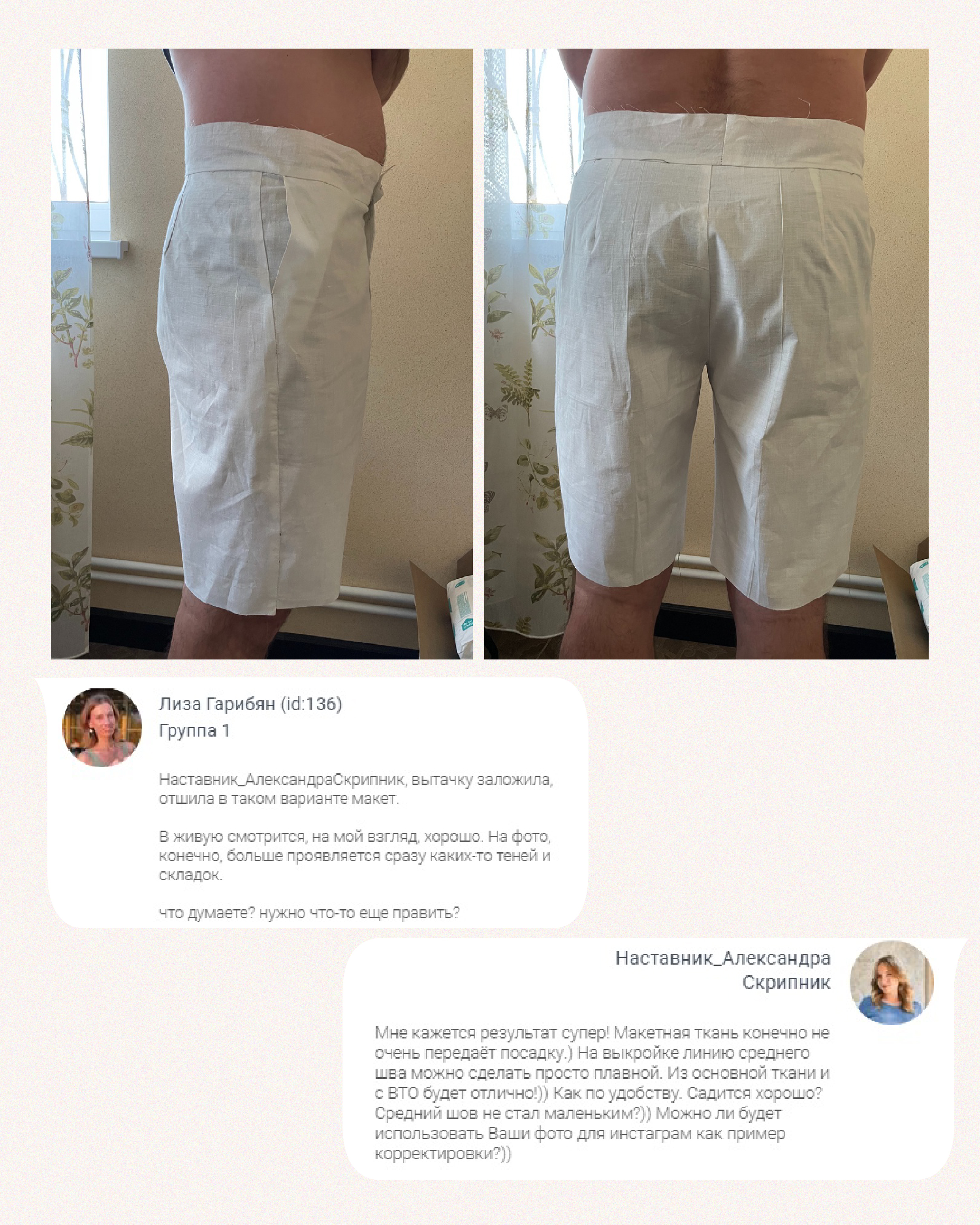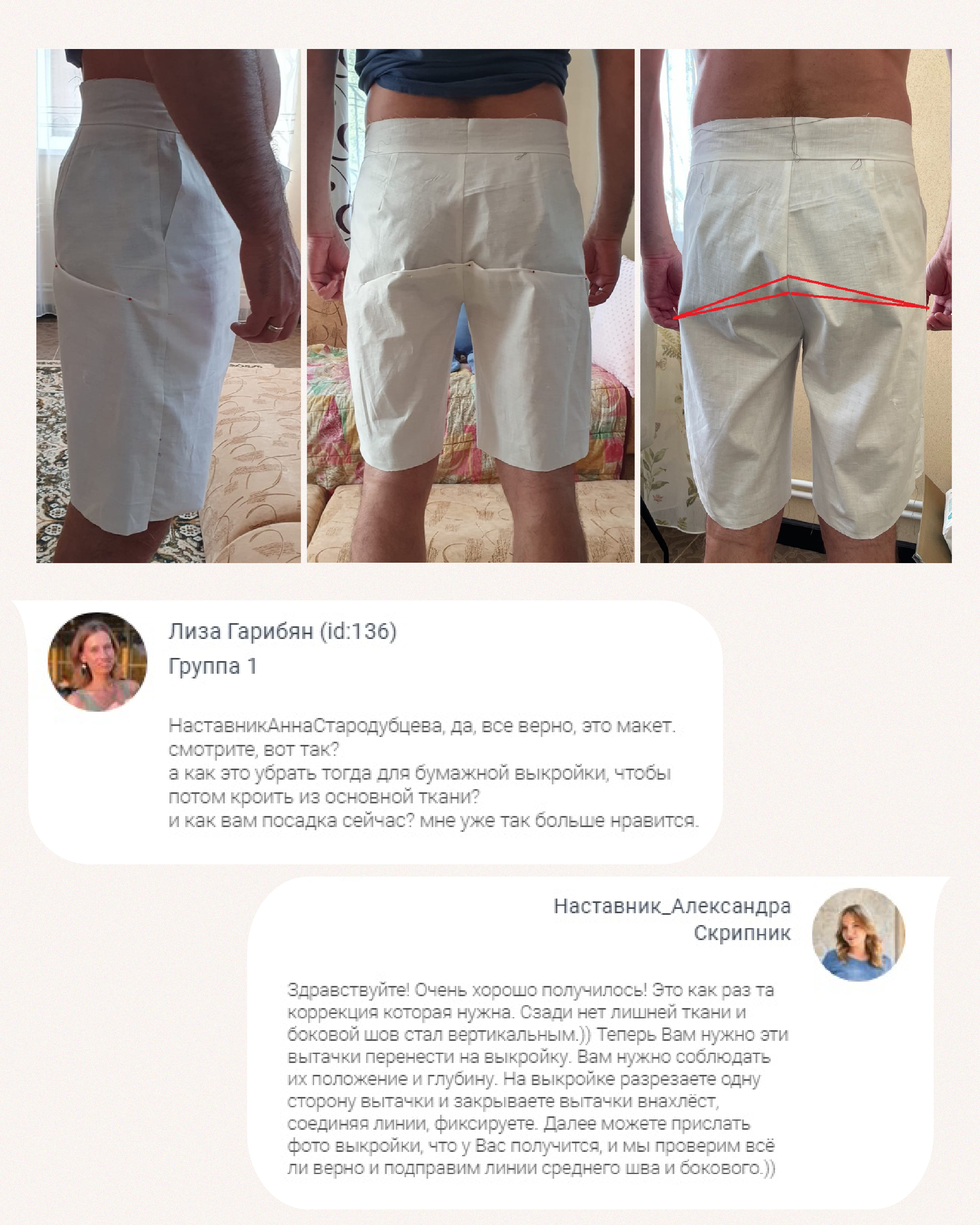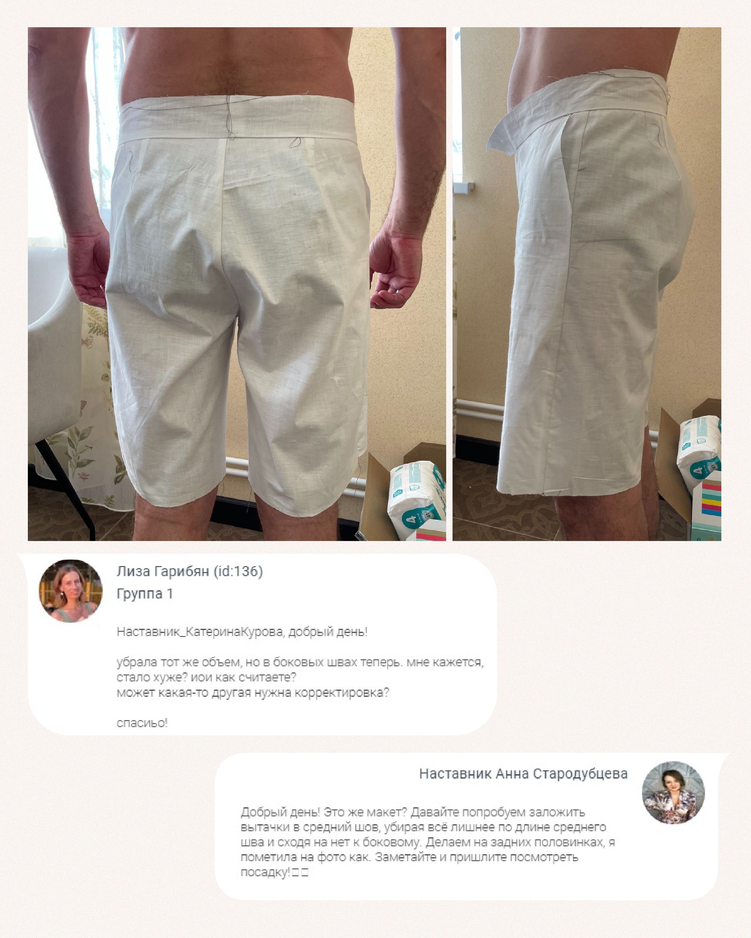 Участница Мастерской Vikisews прислала наставнику фотографии макета шортов и задала вопрос, почему так много ткани собирается сзади и как это можно исправить?