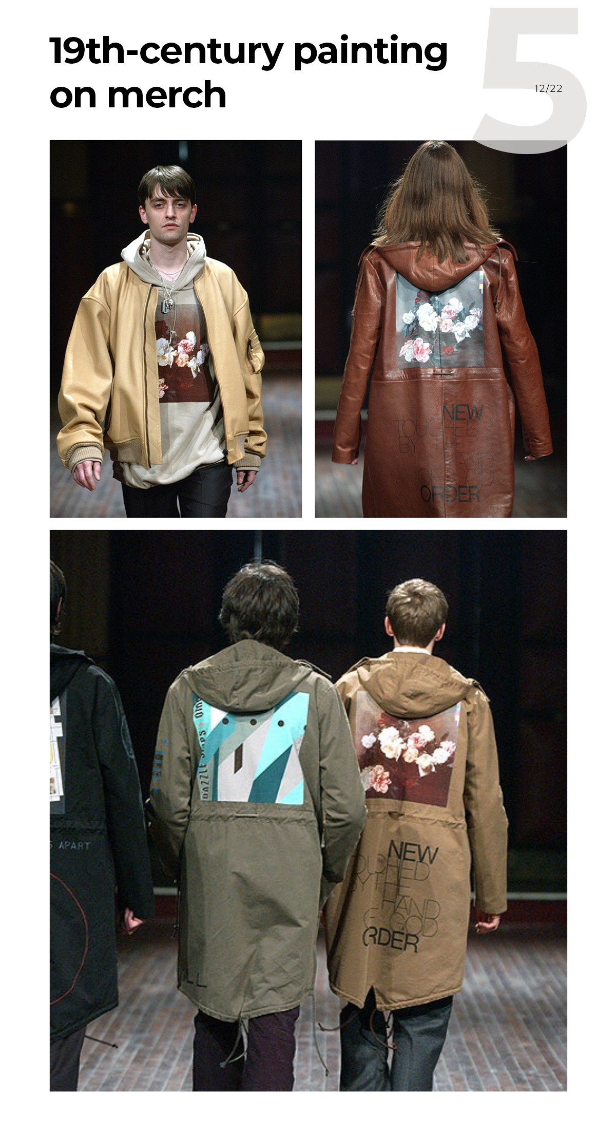 Raf Simons managed to create merch even in collaboration with a 19th-century French painter. In the Fall 2001 collection, the brand showed a parka coat with a subtle edit of Henri Fantin-Latour’s “A Basket of Roses” on the back. The painting was edited by Peter Saville as well, for New Order’s album cover. By the way, this print was also used by Supreme later.
