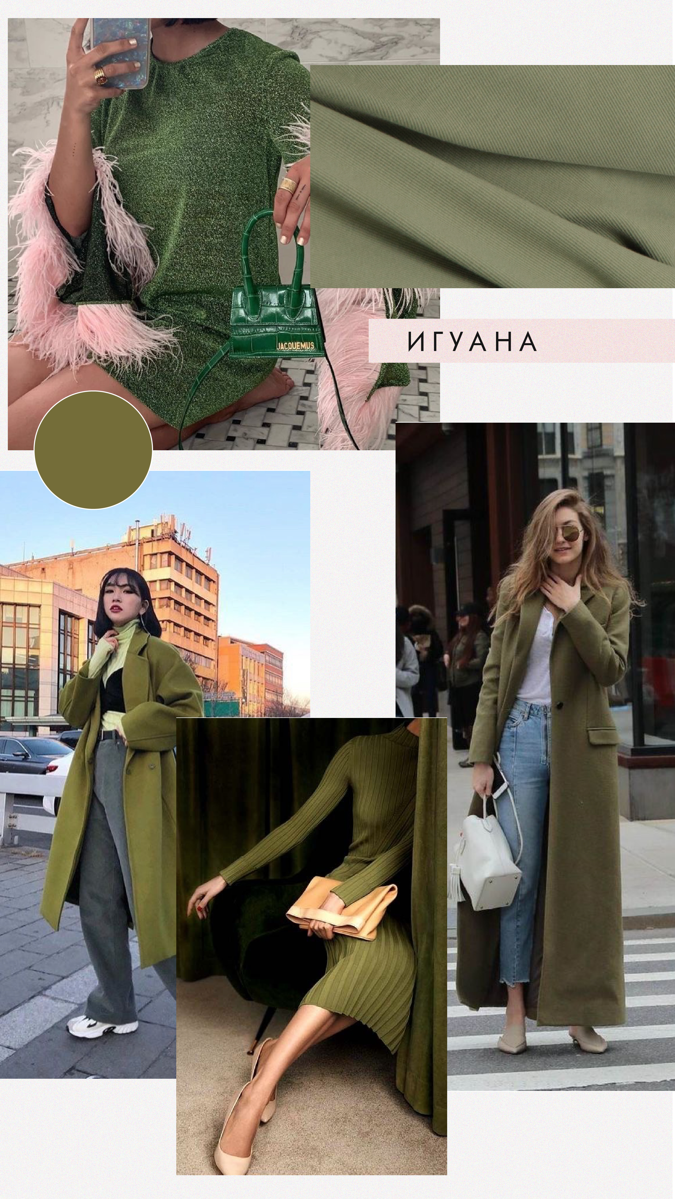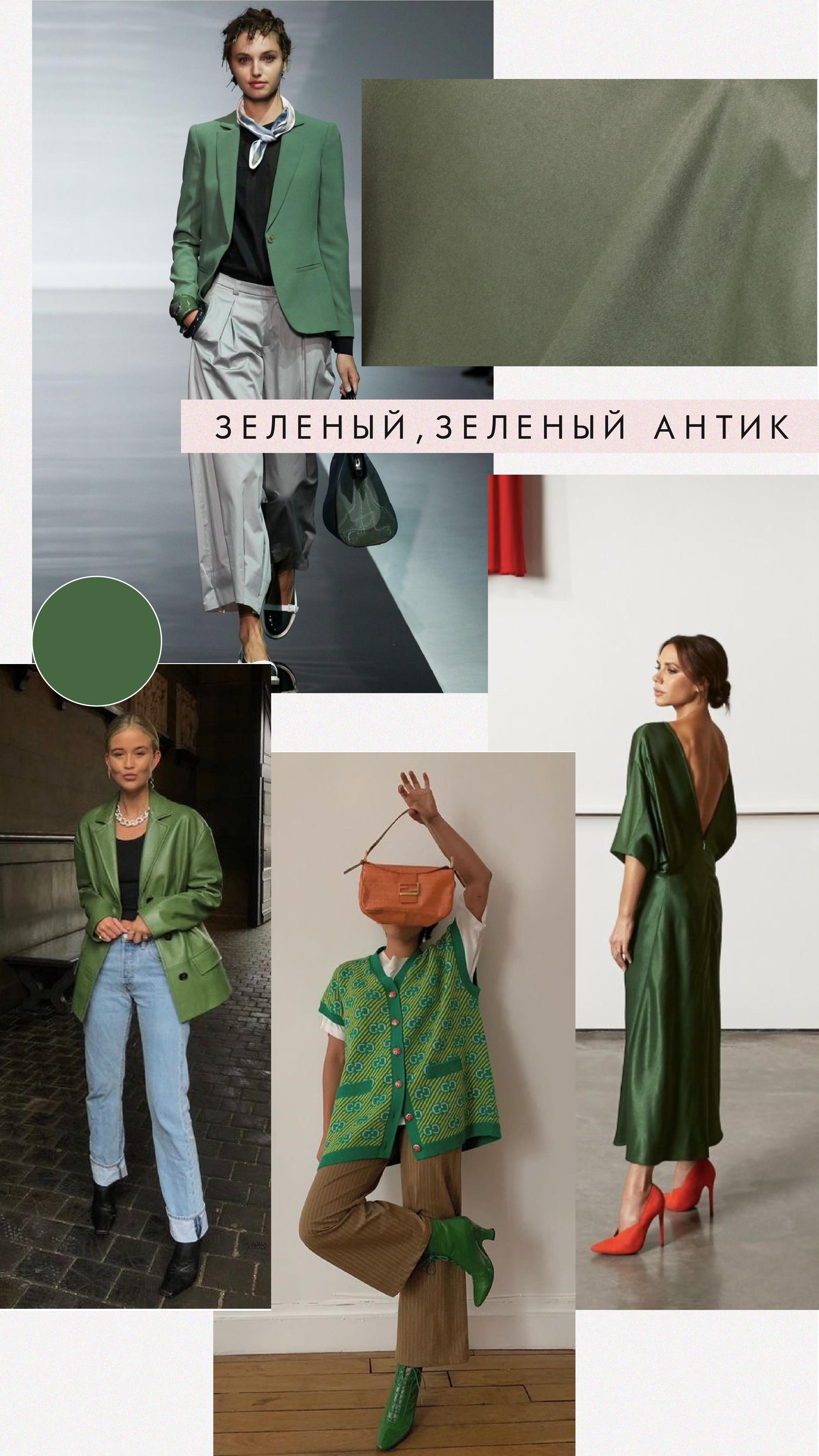 Хаки, зеленый антик, зеленая костюмная ткань — все приглушенные, нейтральные. Они сочетаются со многими цветами и будут фоном.