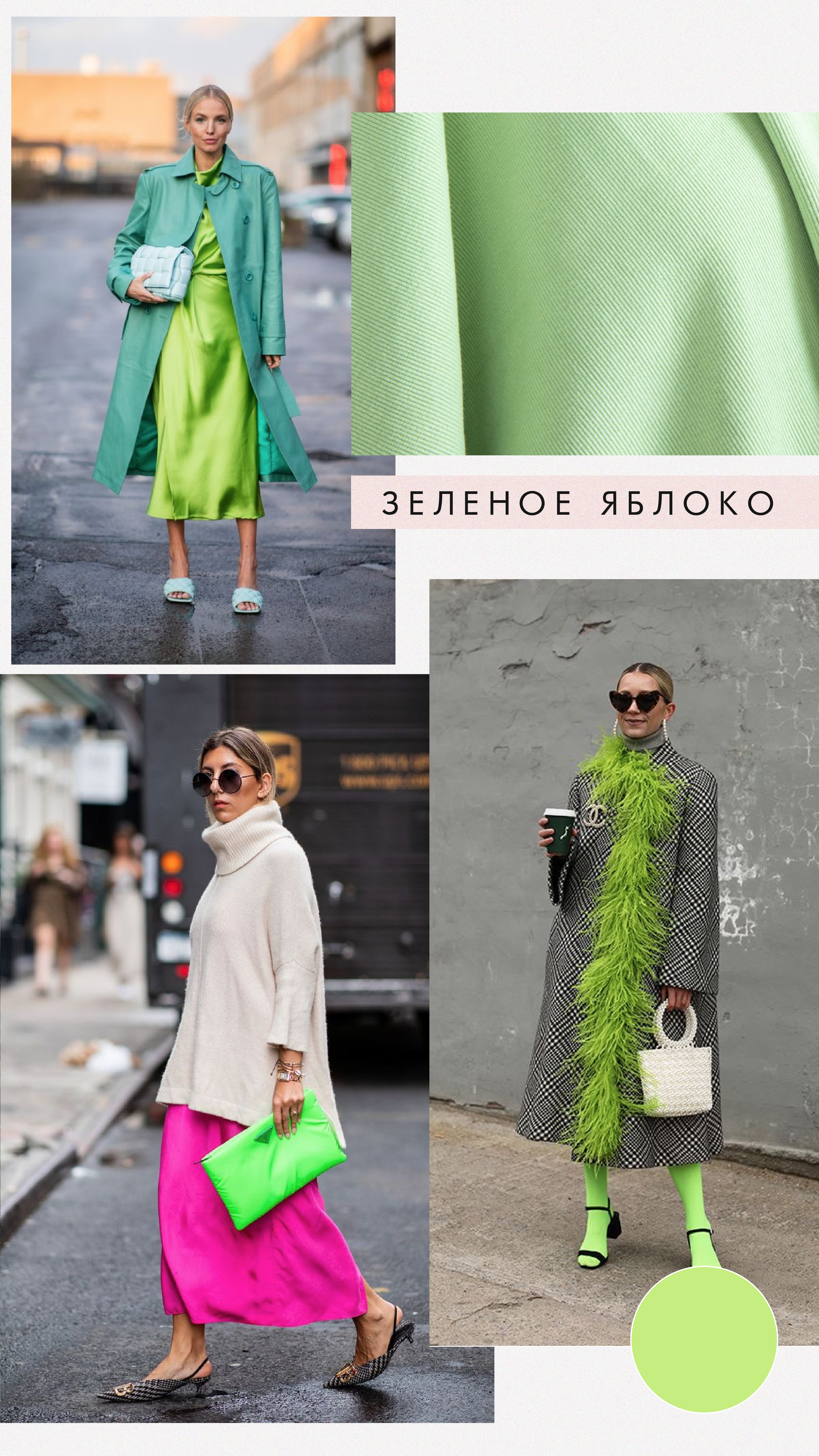 Зеленое яблоко — теплый и достаточно яркий цвет. С ним выбирайте нейтральные (вроде бежевого, чтобы приглушить) или такие же по насыщенности и выразительности.