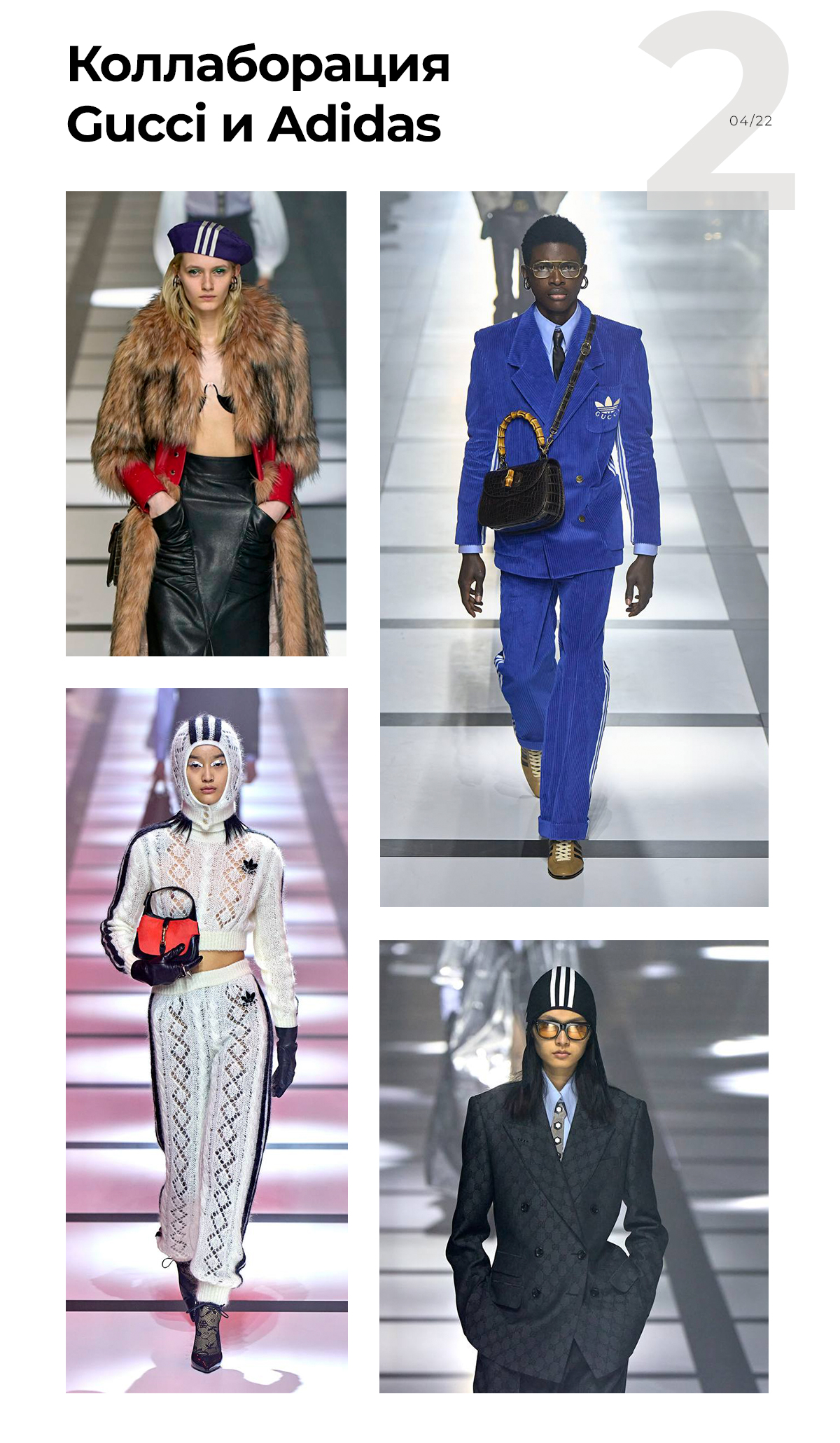 Коллаборация Gucci и Adidas — неожиданное сотрудничество, но результат — восторг. Логотипы, фирменные полоски, смешение стилей. В общем, теперь официально можно надевать спортивные штаны Adidas с сумкой Jackie Gucci.