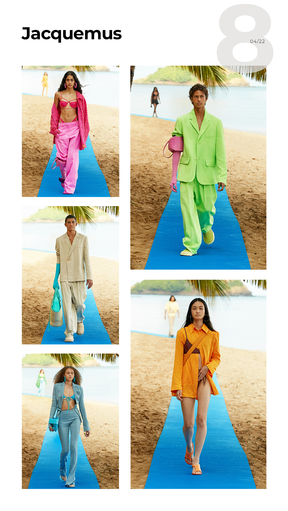 Коллекция Jacquemus пронизана приятными отпускными нотками. В ней апре-ски, легинсы с разрезами, расслабленный крой, брюки карго, объемные жакеты и сексуальные разрезы и вырезы.