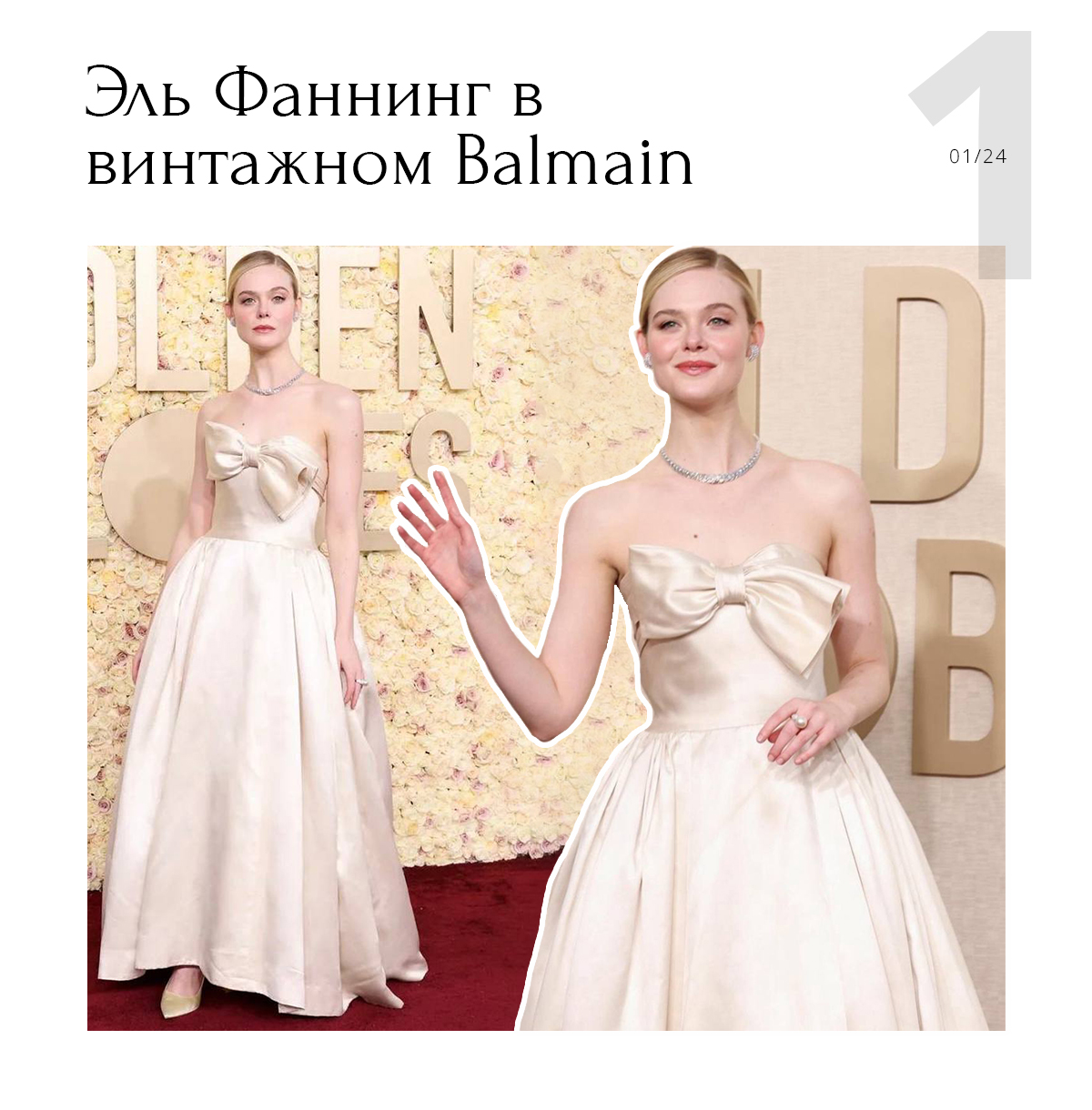 Актриса Эль Фаннинг выбрала для церемонии архивный наряд и пришла в винтажном платье Balmain. Помните, мы уже отмечали, что это яркий тренд 2024? Это платье создавал сам Пьер Бальмен.