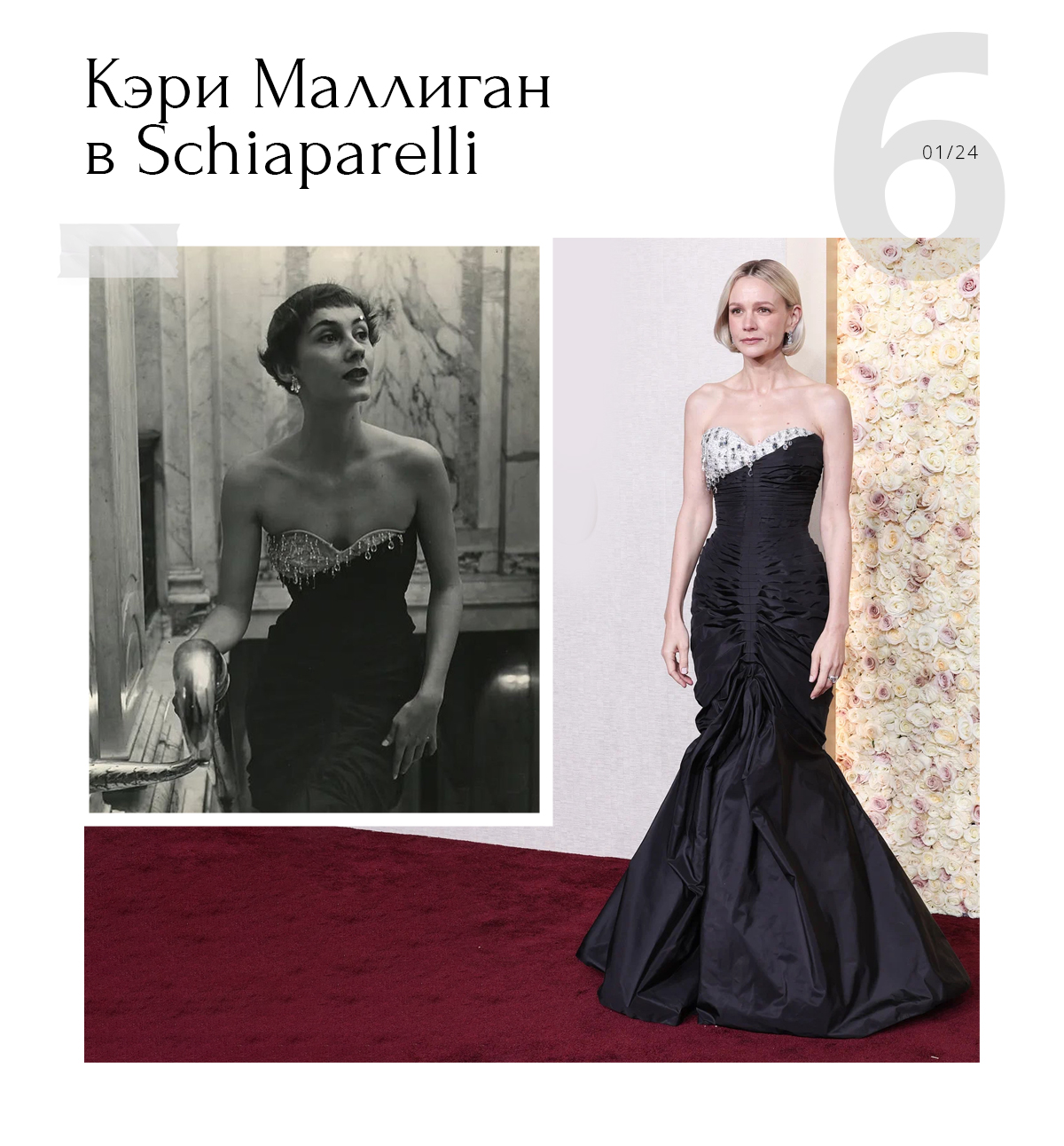 Кэри Маллиган тоже вышла в Schiaparelli. У нее был кастомизированный наряд от креативного директора бренда Дэниела Розберри. Дизайнер создал для актрисы копию образа от Эльзы Скиапарелли из коллекции 1949 года.