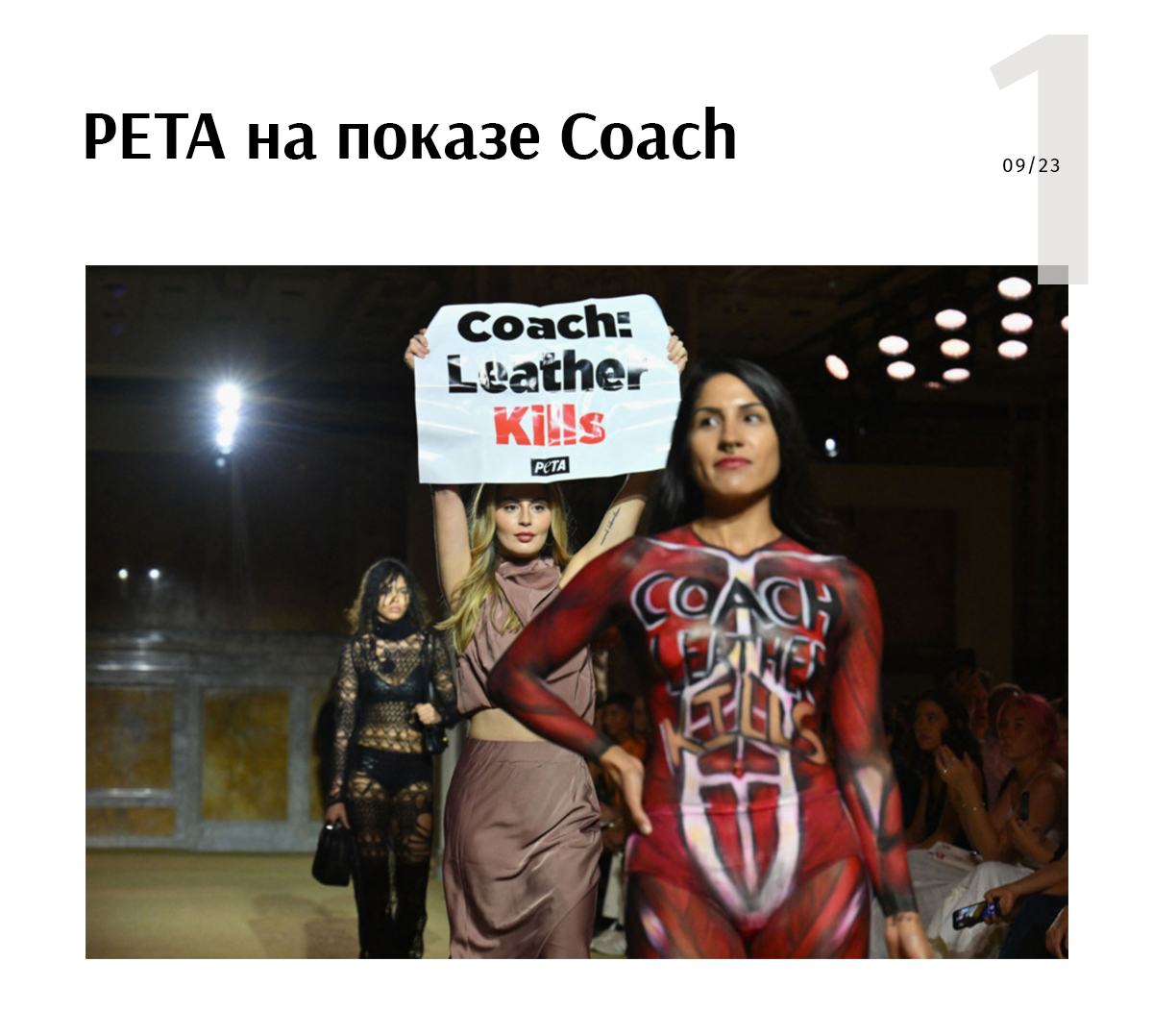 Активисты затесались в один ряд с моделями и прошли по подиуму с лозунгом байкотировать бренд за использование натуральной кожи. Но дело в том, что они очень органично вписались в показ. Оператор долго сканировал камерой девушку с боди-артом в виде освежеванного мяса, думая, что это модель. Этот момент показа завирусился больше всех других. Многие думают, что все представление было постановкой, потому что Coach привлекли много внимания, показ обсуждали долго, и про бренд узнали все, кто не слышал о нем раньше.