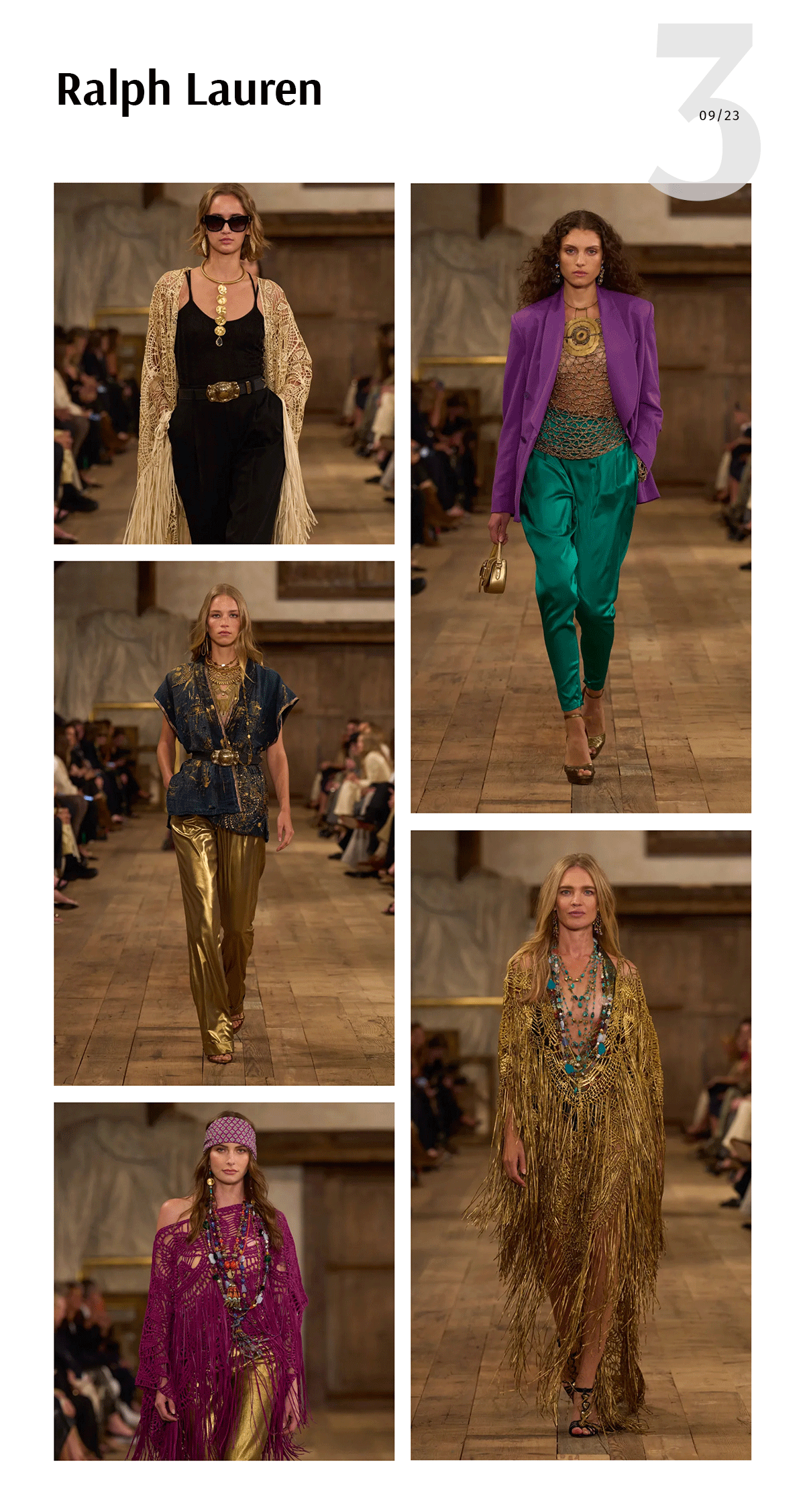 Ralph Lauren вернулся на Неделю моды после перерыва и пропущенного сезона. Помимо огромного количества золота и американского гламура в коллекции, внимание привлек звездный эшелон моделей: Имаан, Влада Рослякова, Мариякарла Босконо, Кристи Тарлингтон и Наталья Водянова. Правда, самым ярким событием шоу стала не коллекция, а казус — Наталья Водянова наступила на шлейф платья Кристи Тарлингтон и чуть не упала.
