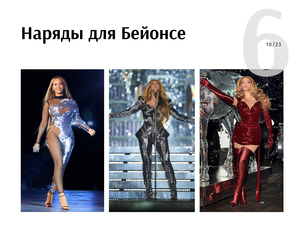 Еще она продумывала наряды для Бейонсе в ее уже культовом мировом турне Renaissance. Бренд Маккуин под руководством Сары создал более десятка образов для певицы.