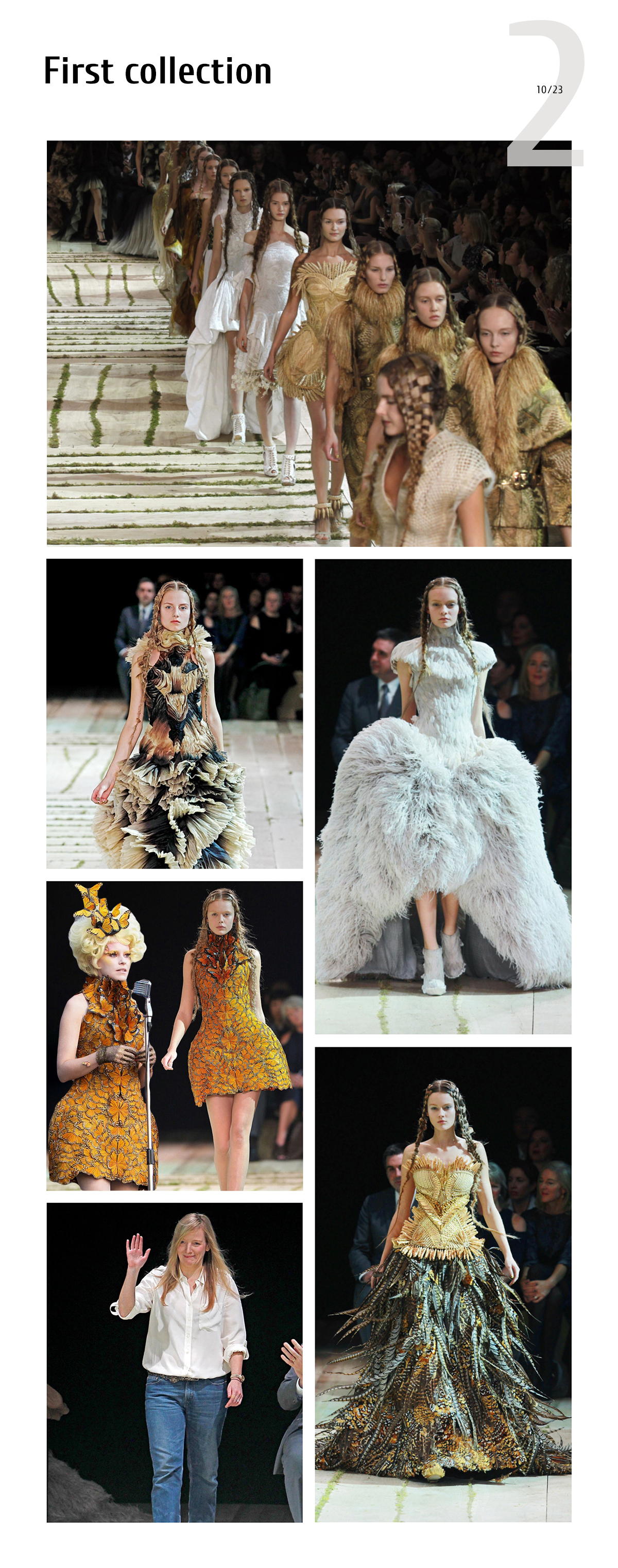 In the early days of being a creative director, Burton continued to develop the ideas she and McQueen had been working on together and tried her best to maintain the brand’s DNA. Her first collection (SS 2011) got a warm welcome and was called one of the most successful debut collections in fashion history. She was inspired by how women are very much similar to elves. Burton used McQueen’s favorite details: elaborate embroidery, gold, draping, feathers, punk black leather, and fire print.