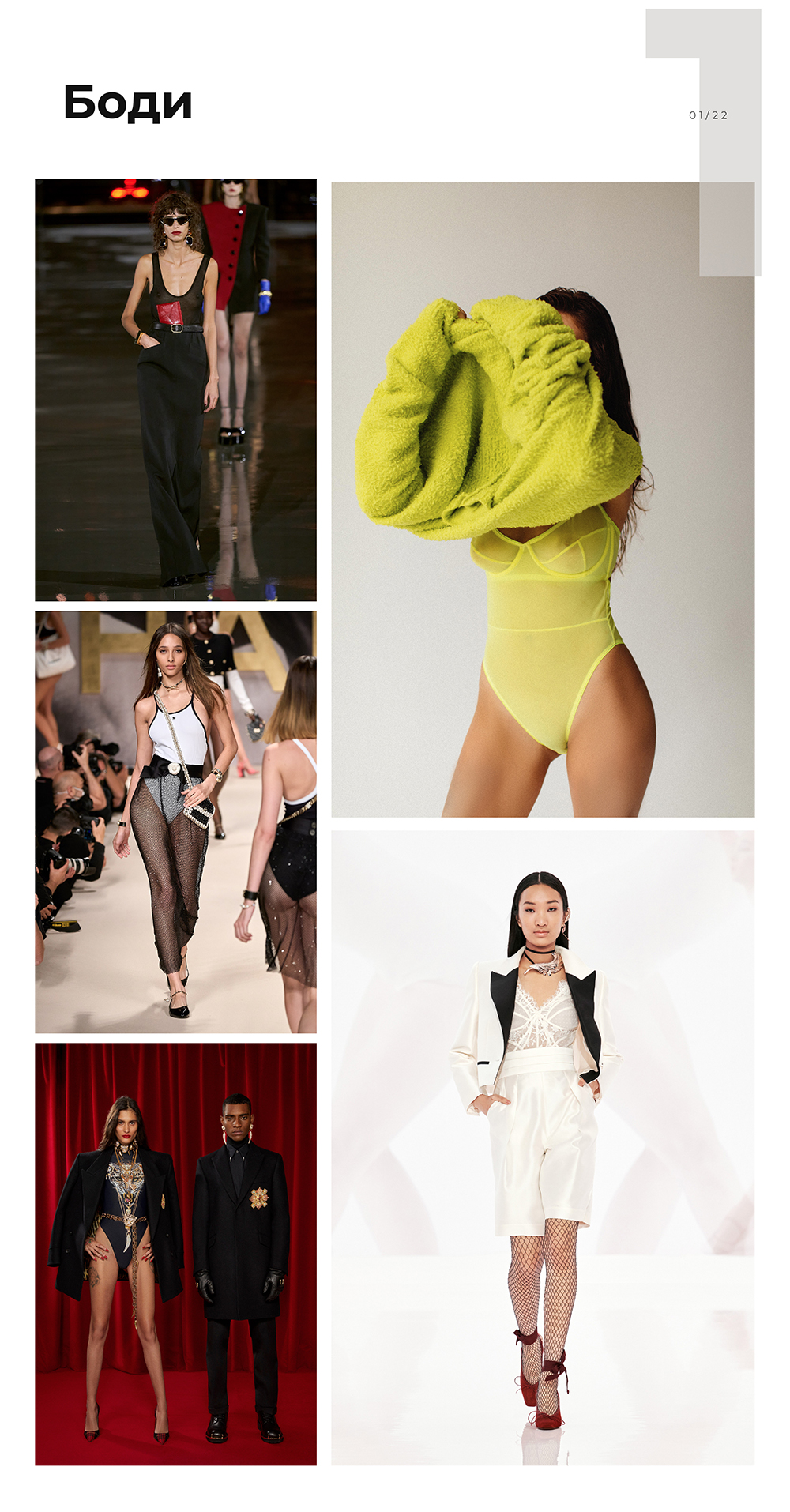 Каким сделать боди? Минималистичным, например в сетку, или кружевным, ярким, спокойного цвета или ахромат — любым. Самый модный вариант — боди в сетку с вышивкой или аппликациями под тату. Оно может быть нюдовым — главное, подобрать в тон кожи — или цветным, но тогда не будет эффекта голого тела, хотя тоже смотрится интересно.