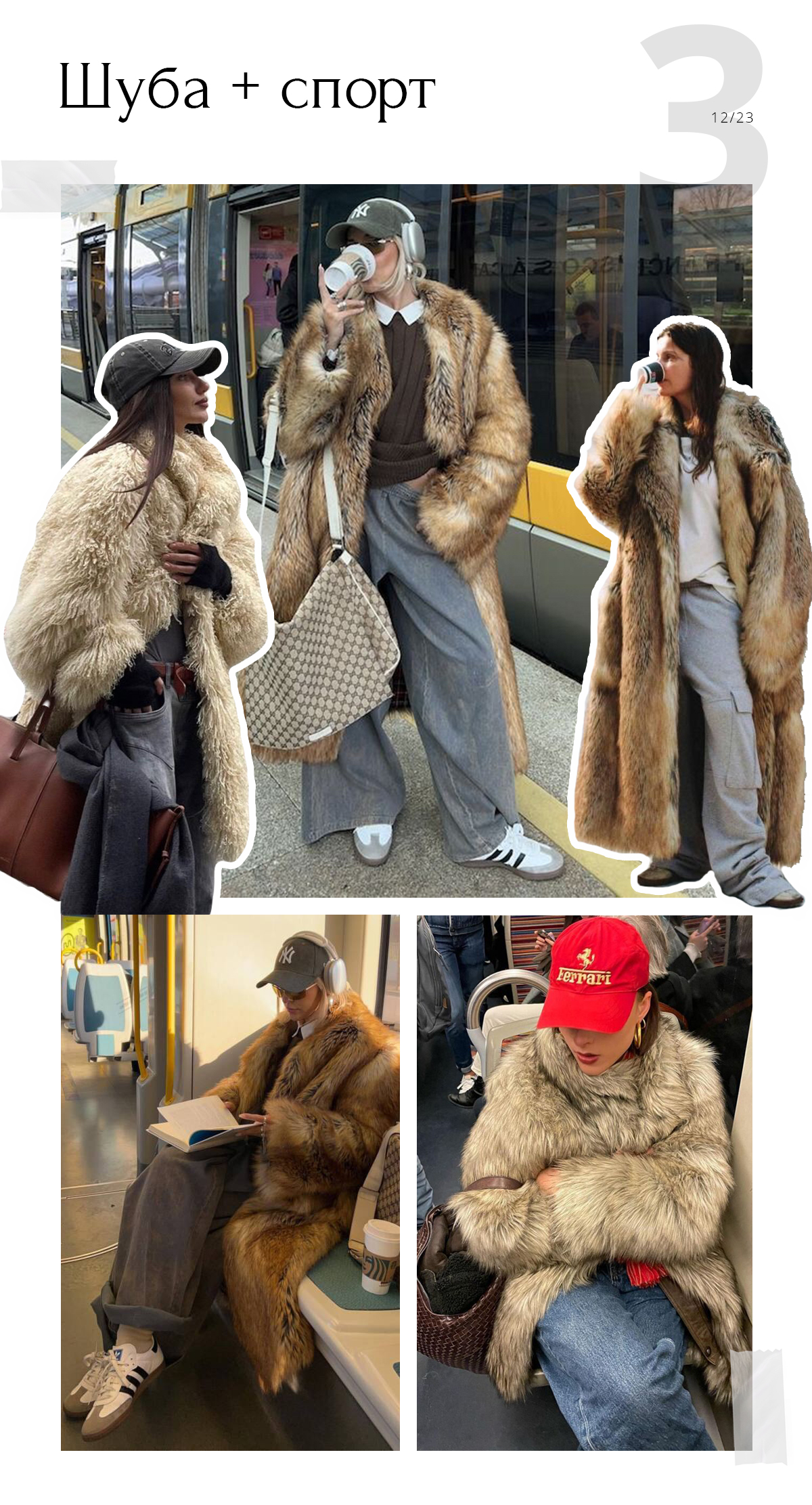 Шуба + треники — это новый спорт-шик. Шуба может быть любой: винтажная, из натурального или искусственного меха.